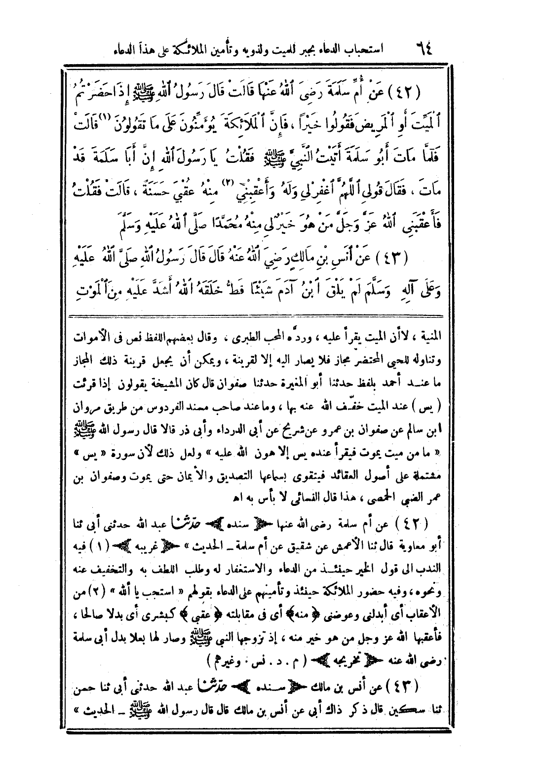 (42) عن أم سلمة رضى الله عنها قالت قال رسول الله صلى الله عليه وسلم إذا حضرتم الميت أو المريض فقولوا خيرًا، فإن الملائكة يؤمنون على ما تقولون قالت فلما مات أبو سلمة أتيت النبي صلى الله عليه وسلم فقلت يا رسول الله إن أبا سلمة قد مات، فقال قولي اللهم اغفر لي وله وأعقبني منه عقبى حسنة، قالت فقلت فأعقبني الله عز وجل من هو خير لي منه محمدًا صلى الله عليه وسلم.
