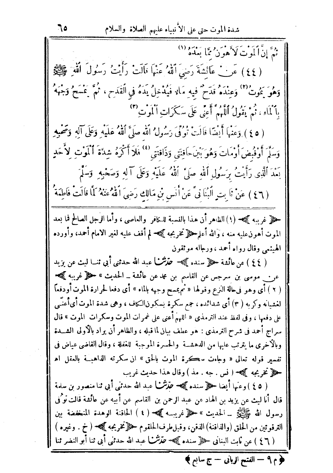 (44) عن عائشة (سنده) حدّثنا عبد الله حدثنى أبى ثنا ليث عن يزيد عن موسى بن سرجس عن القاسم بن محمد عن عائشة الحديث" (غريبه) (2) أى وهو فى حالة النزع وقولها "ثم يمسح وجهه بالماء" أى دفعا لحرارة الموت أو دفعًا لغشيانه وكريه (3) أى شدائده، جمع سكرة بسكون الكاف، وهى شدة الموت أى أعنّى على دفعها، وفى لفظ عند الترمذى "اللهم أعنى على غمرات الموت وسكرات الموت" قال سراج أحمد فى شرح الترمذى: هو عطف بيان لما قبله، والظاهر أن يراد بالأولى الشدة وبالأخرى ما يترتب عليها من الدهشة والحسرة الموجبة للغفلة، وقال القاضى عياض فى تفسير قوله تعالى {وجاءت سكرة الموت بالحق} ان سكرته الذاهبة بالعقل اهـ (تخريجه) (نس. جه. مذ) وقال هذا حديث غريب