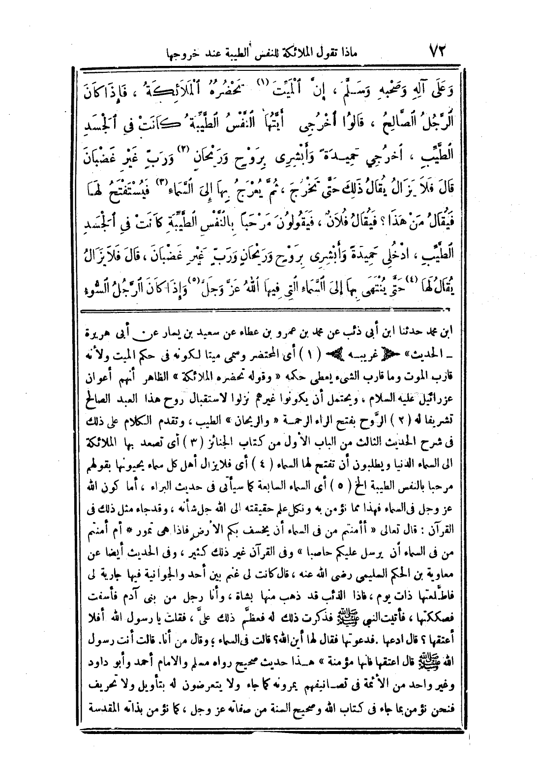 ابن محمد حدثنا ابن أبى ذئب عن محمد بن عمرو بن عطاء عن سعيد بن يسار عن أبى هريرة الحديث" (غريبه) (1) أى المحتضر وسمى ميتا لكونه فى حكم الميت ولأنه قارب الموت وما قارب الشئ يعطى حكمه "وقوله تحضره الملائكة" الظاهر أنهم أعوان عزرائيل عليه السلام، ويحتمل أن يكونوا غيرهم نزلوا لاستقبال روح هذا العبد الصالح تشريفا له (2) الرَّوح بفتح الراء الرحمة "والريحان" الطيب، وتقدم الكلام على ذلك فى شرح الحديث الثالث من الباب الأول من كتاب الجنائز (3) أى تصعد بها الملائكة الى السماء الدنيا ويطلبون أن تفتح لها السماء الدنيا ويطلبون أن تفتح لها السماء (4) أى فلا يزال أهل كل سماء يحيونها بقولهم مرحبا بالنفس الطيبة الخ (5) أى السماء السابعة كما سيأتى فى حديث البراء، أما كون الله عز وجل فى السماء فهذا مما نؤمن به ونكل علم حقيقته الى الله جل شأنه، وقد جاء مثل ذلك فى القرآن: قال تعالى {أأمنتم من فى السماء أن يخسف بكم الأرض فاذا هى تمور * أم أمنتم من فى السماء أن يرسل عليكم حاصبا" وفى القرآن غير ذلك كثير، وفى الحديث أيضا عن معاوية بن الحكم السليمي رضي الله عنه، قال كانت لى غنم بين أحد والجوانية فيها جارية لى فاطَّلعتها ذات يوم، فاذا الذئب قد ذهب منها بشاة، وأنا رجل من بنى آدم فأسفت فصككتها، فأتيت النبى صلى الله عليه وسلم فذكرت ذلك له فعظَّم ذلك علىَّ، فقلت يا رسول الله أفلا أعتقها؟ قال ادعها. فدعوتها فقال لها أين الله؟ قالت فى السماء؛ وقال من أنا. قالت أنت رسول الله صلى الله عليه وسلم قال اعتقها فانها مؤمنة" هذا حديث صحيح رواه مسلم والامام أحمد وأبو داود وغير واحد من الأئمة فى تصانيفهم يمرونه كما جاء ولا يتعرضون له بتأويل ولا تحريف فنحن نؤمن بما جاء فى كتاب الله وصحيح السنة من صفاته عز وجل، كما نؤمن بذاته المقدسة