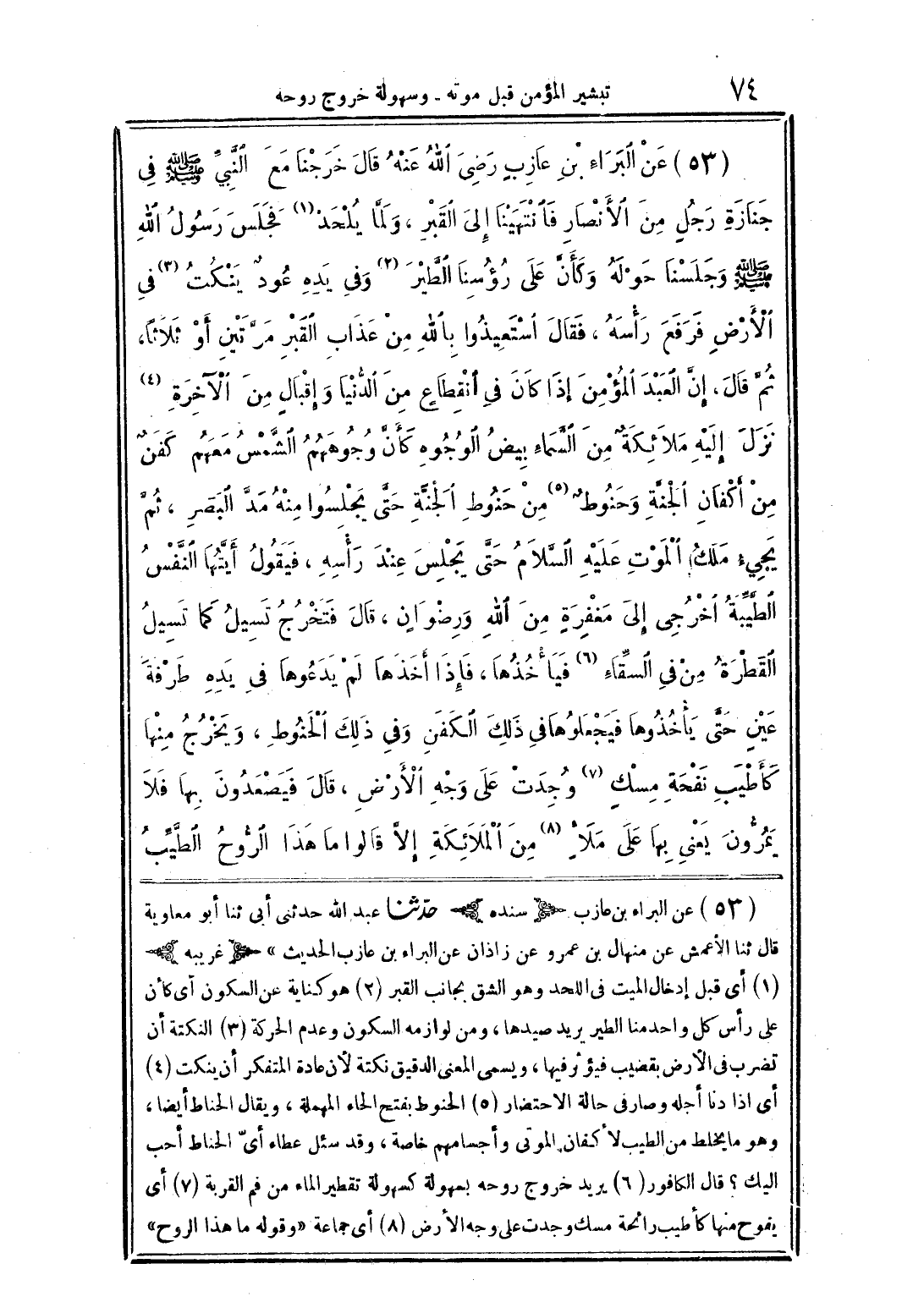 (53) عن البراء بن عازب (سنده) حدّثنا عبد الله حدثنى أبى ثنا أبو معاوية قال ثنا الأعمش عن منهال بن عمرو عن زاذان عن البراء بن عازب الحديث" (غريبه) (1) أى قبل إدخال الميت فى اللحد وهو الشق بجانب القبر (2) هو كناية عن السكون أى كأن على رأس كل واحد منا الطير يريد صيدها، ومن لوازمه السكون وعدم الحركة (3) النكتة أن تضرب فى الأرض بقضيب فيؤثر فيها، ويسمى المعنى الدقيق نكته لأن عادة المتفكر أن ينكت (4) أى اذا دنا أجله وصار فى حالة الاحتضار (5) الحنوط بفتح الحاء المهملة، ويقال الحناط أيضا، وهو ما يخلط من الطيب لأكفان الموتى وأجسامهم خاصة، وقد سئل عطاء أىّ الحناط أحب اليك؟ قال الكافور (6) يريد خروج روحه بسهولة كسهولة تقطير الماء من فم القربة (7) أى يفوح منها كأطيب رائحة مسك وجدت على وجه الأرض (8) أى جماعة "وقوله ما هذا الروح"