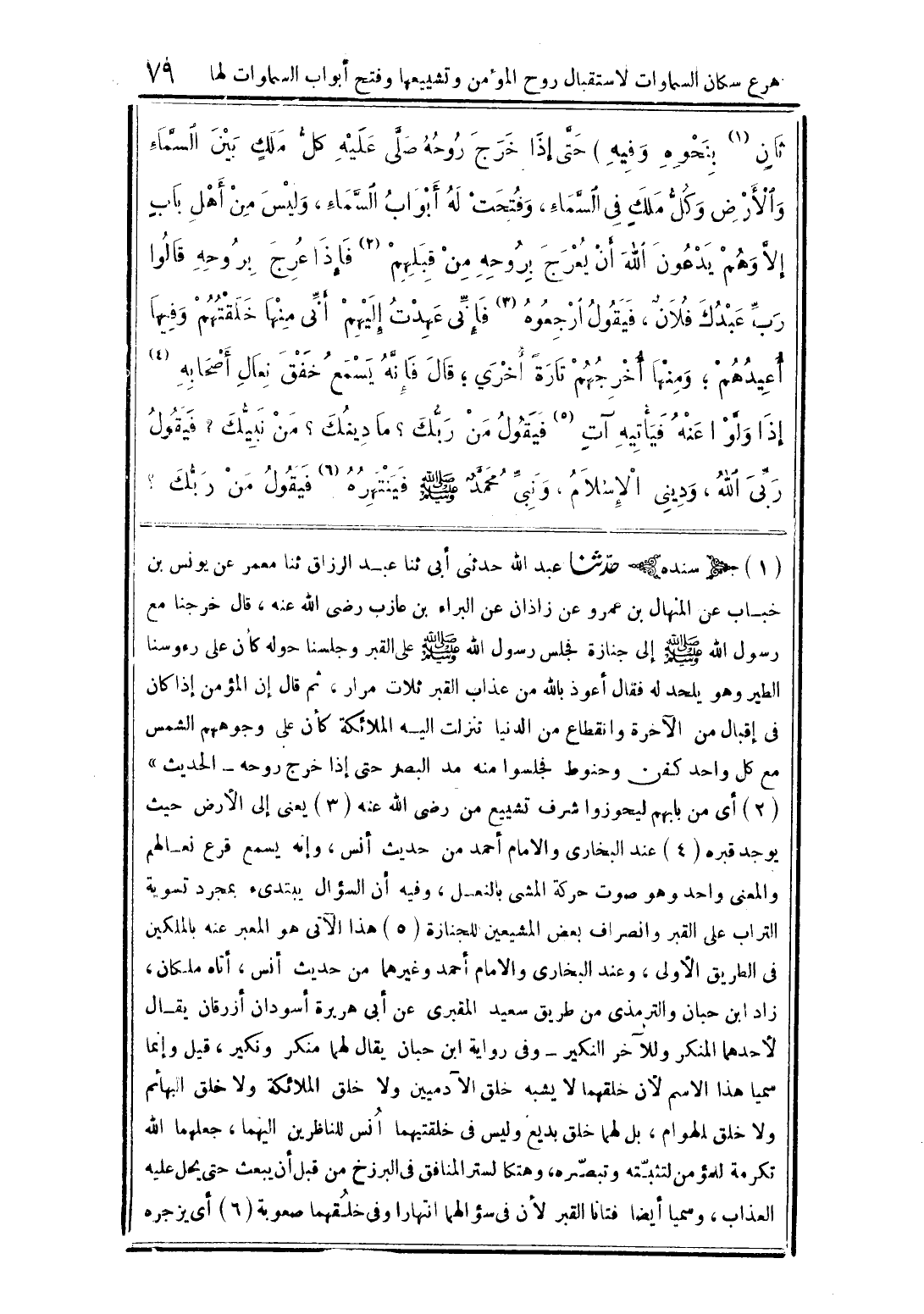 (1) "سنده" حدّثنا عبد الله حدثنى أبى ثنا عبد الرازق ثنا معمر عن يونس بن خباب عن المنهال بن عمرو بن زاذان عن البراء بن عازب رضى الله عنه، قال خرجنا مع رسول الله صلى الله عليه وسلم إلى جنازة فجلس رسول الله صلى الله عليه وسلم على القبر وجلسنا حوله كأن على رءوسنا الطير وهو يلحد له فقال أعوذ بالله من عذاب القبر ثلاث مرات، ثم قال إن المؤمن إذا كان فى إقبال من الآخرة وانقطاع من الدنيا تنزلت اليه الملائكة كأن على وجوههم الشمس مع كل واحد كفن وحنوط فجلسوا منه مد البصر حتى إذا خرج روحه - الحديث" (2) أى من بابهم ليحوزوا شرف تشييع من رضى الله عنه (3) يعنى إلى الأرض حيث يوجد قبره (4) عند البخارى والامام أحمد من حديث أنس، وإنه يسمع فرع نعالهم والمعنى واحد وهو صوت حركة المشى بالنعل، وفيه أن السؤال يبتدئ بمجرد تسوية التراب على القبر وانصراف بعض المشيعين للجنازة (5) هذا الآتى هو المعبر عنه بالملكين فى الطريق الأولى، وعند البخارى والامام أحمد وغيرهما من حديث أنس، أتاه ملكان، زاد ابن حبان والترمذى من طريق سعيد المقبرى عن أبى هريرة أسودان أزرقان يقال لأحدهما المنكر وللآخر النكير - وفى رواية ابن حبان يقال لهما منكر ونكير، قيل وإنما سميا هذا الاسم لأن خلقهما لا يشبه خلق الآدميين ولا خلق الملائكة ولا خلق البهائم ولا خلق الهوام، بل لهما خلق بديع وليس فى خلقتيهما أنس للناظرين اليهما، جعلهما الله تكرمة للمؤمن لتثبّته وتبصّره، وهتكا لستر المنافق فى البرزخ من قبل أن يبعث حتى يحل عليه العذاب، وسميا أيضا فتانا القبر لأن فى سؤالهما انّهارا وفى خلقهما صعوبة (6) أي يزجره