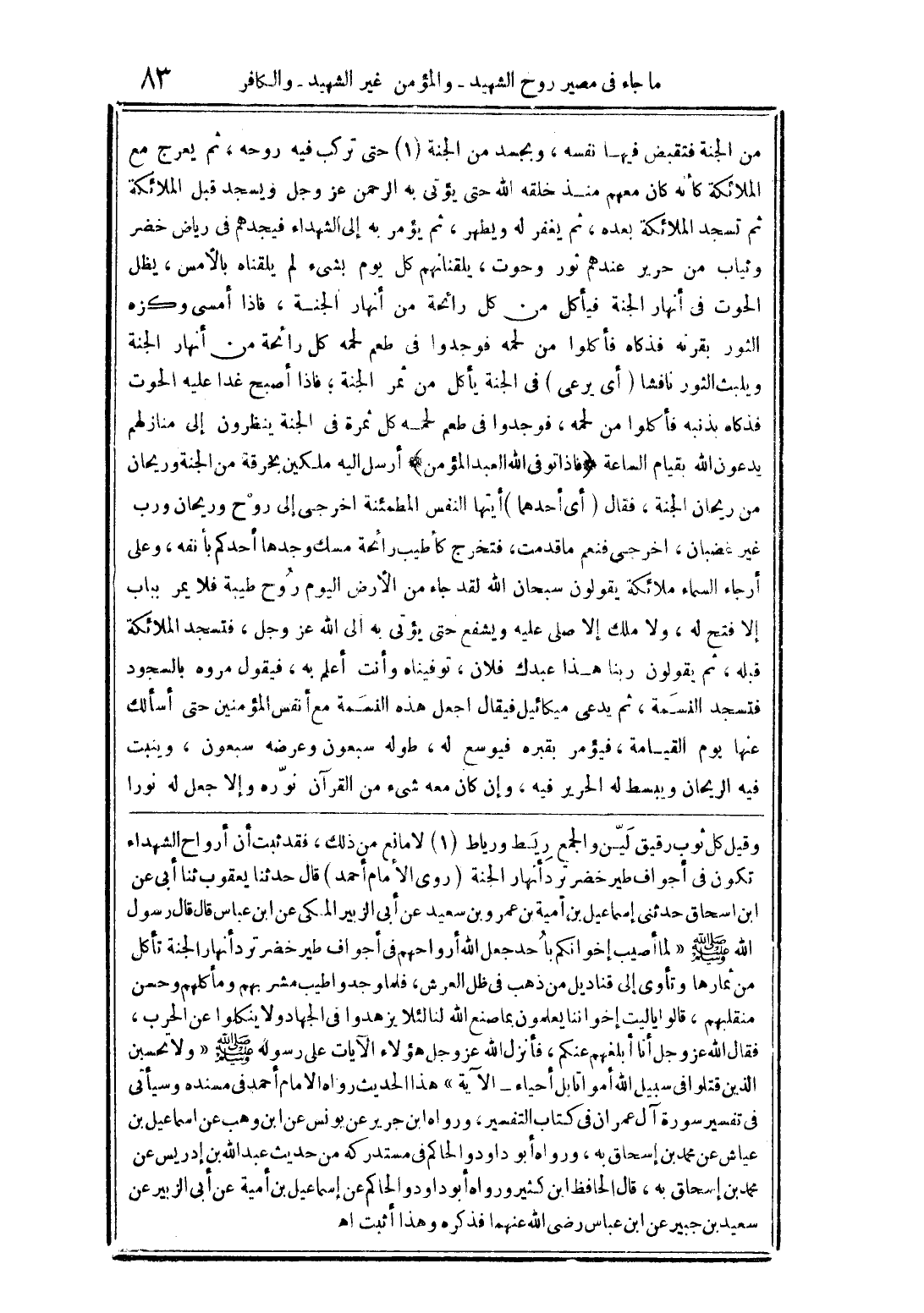 وقيل كل ثوب رقيق ليّن والجمع ريط ورياط (1) لا مانع من ذلك، فقد ثبت أن أرواح الشهداء تكون فى أجواف طير خضر ترد أنهار الحنة (رو ى الأمام أحمد) قال حدثنا يعقوب ثنا أبى عن ابن اسحاق حدثنى إسماعيل بن آمية بن عمرو بن سعيد عن أبى الزبير المكى عن ابن عباس قال قال رسول الله صلى الله عليه وسلم: "لما أصيب إخوانكم باحد جعل الله أرواحهم فى أجواف طير خضر ترد أنهارا الجنة تأكل من ثارها وتأوى إلى قناديل من ذهب فى ظل العرش، فلما وجد واطيب مشربهم ومأكلهم وحسن منقلبهم، قالوا يا لين إخواننا يعلمون بما صنع الله لنا لئلا يزهدوا فى الجهاد ولا ينكلوا عن الحرب، فقال الله عز وجل أنا أبلغهم عنكم، فأنزل الله عز وجل هؤلاء الآيات على رسوله صلى الله عليه وسلم {ولا تحسبن الذين قتلوا فى سبيل الله أمواتا بل أحياء - الآية} هذا حديث رواه الامام أحمد فى مسنده وسيأتى فى تفسير سورة آل عمران فى كتاب التفسير، ورواه ابن جرير عن يونس عن ابن وهب عن اسماعيل بن عياش عن محمد بن إسحاق به، ورواه أبو داود الحاكم فى مستدركه من حديث عبد الله بن إدريس عن محمد بن إسحاق به، قال الحافظ ابن كثير ورواه أبو داود الحاكم عن إسماعيل بن أمية عن أبى الزبير عن سعيد بن جبير عن ابن عباس رضى الله عنهما فذكره وهذا أثبت اهـ