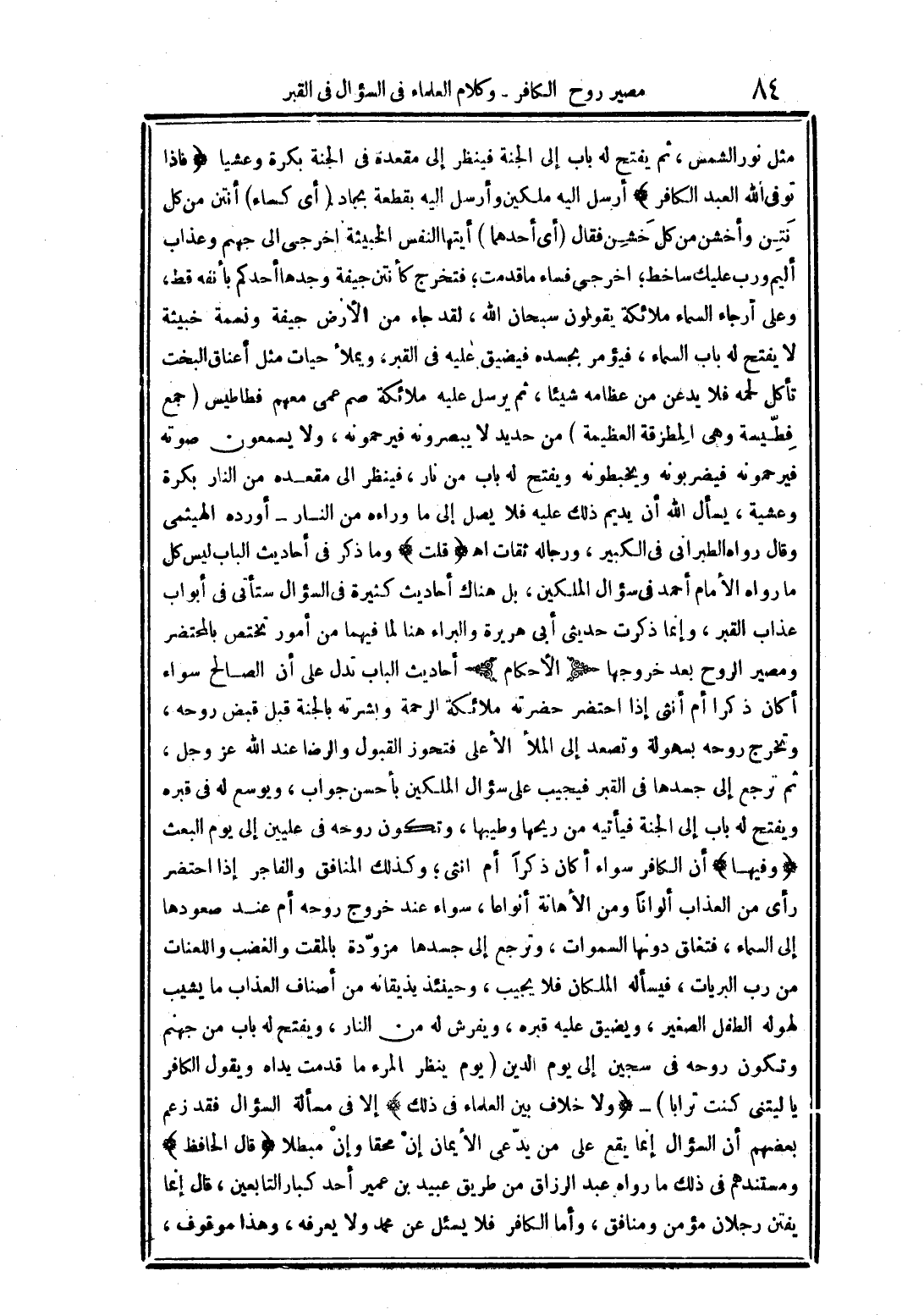 مثل نور الشمس، ثم يفتح له باب إلى الجنة فينظر إلى مقعده في الجنة بكرة وعشيا {فإذا توفى الله العبد الكافر} أرسل إليه ملكين وأرسل إليه بقطعة بجاد (أي كساء) أنتن من كل نتن وأخشن من كل خشن فقال (أي أحدهما) أيتها النفس الخبيثة اخرجي إلى جهنم وعذاب أليم ورب عليك ساخط؛ اخرجي فساء ما قدمت؛ فتخرج كأنتن جيفة وجدها أحدكم بأنفه قط، وعلى أرجاء السماء ملائكة يقولون سبحان الله، لقد جاء من الأرض جيفة ونسمة خبيثة لا يفتح له باب السماء، فيؤمر بجسده فيضيق عليه في القبر، ويملأ حيات مثل أعناق البخت تأكل لحمه فلا يدعن من عظامه شيئا، ثم يرسل عليه ملائكة صم عمى معهم فطاطيس (جمع فطيسة وهى المطزقة العظيمة) من حديد لا يبصرونه فيرحمونه، ولا يسمعون صوته فيرحمونه فيضربونه ويخبطونه ويفتح له باب من نار، فيمظر إلى مقعده من النار بكرة وعشية، يسأل الله أن يديم ذلك عليه فلا يصل إلى ما وراءه من النار أورده الهيثمي وقال رواه الطبراني في الكبير، ورجاله ثقات اهـ {قلت} وما ذكر في أحاديث الباب ليس كل ما رواه الأمام أحمد في سؤال الملكين، بل هناك أحاديث كثيرة في السؤال ستأتي في أبواب عذاب القبر، وإنما ذكرت حديثي أبى هريرة والبراء هنا لما فيهما من أمور تختص بالمحتضر ومصير الروح بعد خروجها {الأحكام} أحاديث الباب تدل على أن الصالح سواء أكان ذكرا أم أنثى إذا احتضر حضرته ملائكة الرحمة وبشرته بالجنة قبل قبض روحه، وتخرج روحه بسهولة وتصعد إلى الملأ الأعلى فتحوز القبول والرضا عند الله عز وجل، ثم ترجع إلى جسدها في القبر فيجيب على سؤال الملكين بأحسن جواب، ويوسع له في قبره ويفتح له باب إلى الجنة فيأتيه من ريحها وطيبها، وتكون روحه في عليين إلى يوم البعث {وفيها} أن الكافر سواء أكان ذكرًا أم أنثى؛ وكذلك المنافق والفاجر إذا احتضر رأى من العذاب ألوانًا ومن الإهانة أنواعا، سواء عند خروج روحه أم عند صعودها إلى السماء، فتغاق دونها السموات، وترجع إلى جسدها مزودة بالمقب والغضب واللعنات من رب البريات، فيسأله الملكان فلا يجيب، وحينئذ يذيقانه من أصناف العذاب ما يشيب لهوله الطفل الصغير، ويضيق عليه قبره، ويفرش له من النار، ويفتح له باب من جهنم وتكون روحه في سجين إلى يوم الدين (يوم ينظر المرء ما قدمت يداه ويقول الكافر يا ليتني كنت ترابا) {ولا خلاف بين العلماء في ذلك} إلا في مسألة السؤال فقد زعم بعضهم أن السؤال إنما يقع على من يدعى الأيمان إن محقا وإن مبطلا {قال الحافظ} ومستندهم في ذلك ما رواه عبد الرزاق من طريق عبيد بن عمير أحد كبار التابعين، قال إنما يفتن رجلان مؤمن ومنافق، وأما الكافر فلا يسئل عن محمد ولا يعرفه، وهذا موقوف،