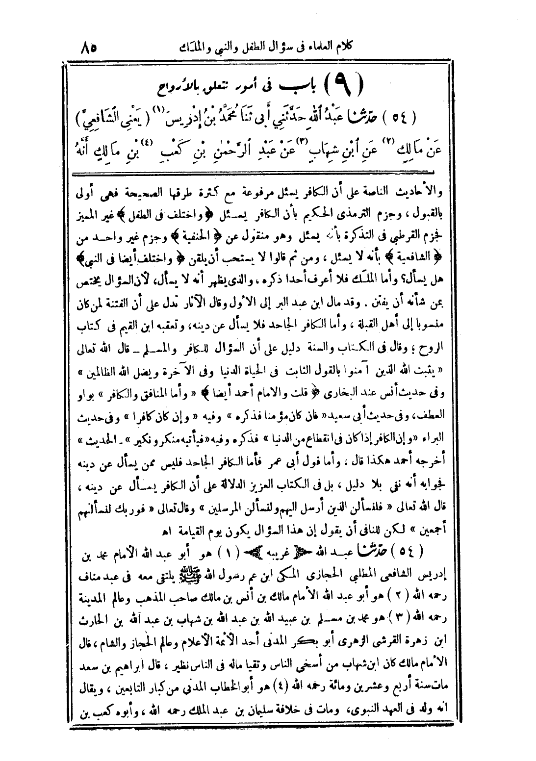 (54) حدثنا عبد الله حدثني أبى ثنا محمد بن إدريس (1) (يعنى الشافعي) عن مالك (2) عن ابن شهاب (3) عن عبد الرحمن بن كعب (4) بن مالك أنه