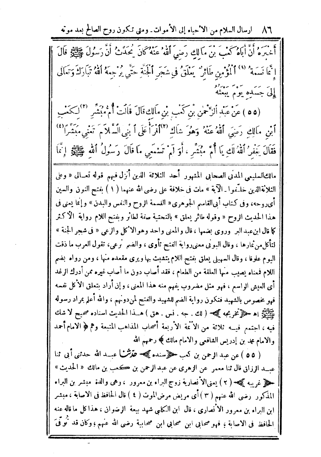 مالك السليمي المدني الصحابى المشهور أحد الثلاثة الذين أنزل فيهم قوله تعالى {وعلى الثلاثة الذين خلفة - الآية} مات فى خلافة على رضى الله عنهما (1) بفتح النون والسين أى روحه، وفى كتاب أبي القاسم الجوهري "النسمة الروح والنفس والبدن" وإنما يعنى فى هذا الحديث الروح "وقوله طائر يعلق" بالتحتية صفة لطائر وبفتح اللام رواية الأكثر كما قال ابن عبد البر وروى بضمها، قال والمعنى واحد وهو الأكل والرعي "فى شجر الجنة" لتأكل من ثمارها، وقال البونى معنى رواية الفتح تأوى، والضم ترعى، تقول العرب ما ذقت اليوم علوقا، وقال السهيلى يعلق بفتح اللام يتشبت بها ويرى مقعده منها، ومن رواه بضم اللام فمعناه يصيب منها العلقة من الطعام، فقد أصاب دون ما أصاب غيره ممن أدرك الرغد أى العيش الواسع، فهو مثل مضروب يفهم منه هذا المعنى، وإن أراد بتعلق الأكل نفسه فهو مخصوص بالشهيد فتكون رواية الضم للشهيد والفتح لمن دونهم، واله أعلم بمراد رسوله صلى الله عليه وسلم اهـ (تخريجه) (لك. جه. نس. هق) هذا الحديث اسناده صحيح لا شك فيه، اجتمع فيه ثلاثة من الأئمة الأربعة أصحاب المذاهب المتبعة وهم (الامام أحمد والامام محمد بن إدريس الشافعى والامام مالك) رحمهم الله