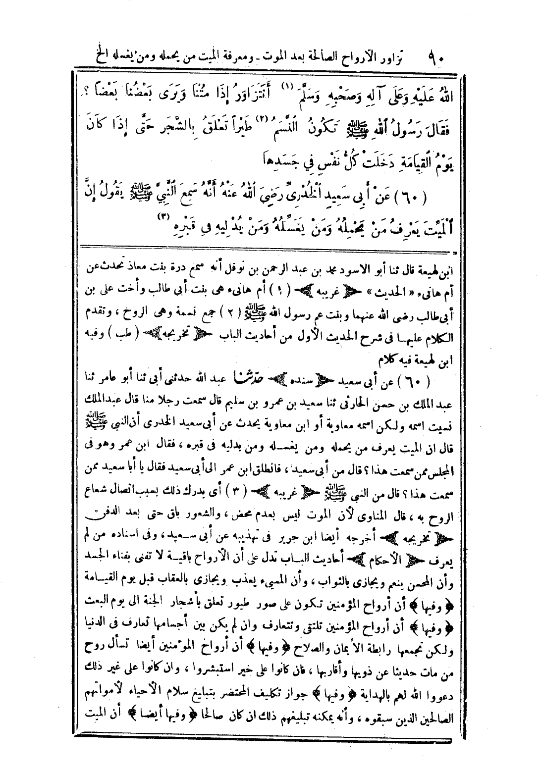 الله عليه وعلى آله وصحبه وسلم (1) أنتزاور إذا متنا ويرى بعضنا بعضًا؟ فقال رسول الله صلى الله عليه وسلم تكون النسم (2) طيرًا تعلق بالشجر حتى إذا كان يوم القيامة دخلت كل نفس في جسدها