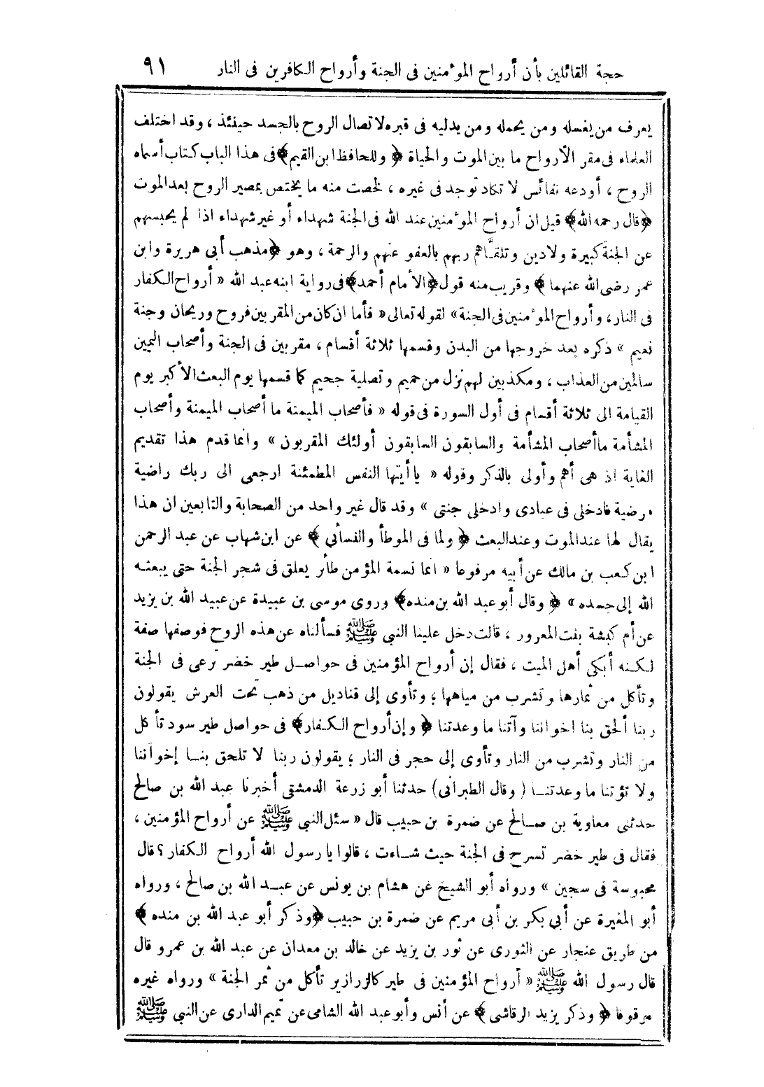 يعرف من يغسله ومن يحمله ومن يدليه في قبره لاتصال الروح بالجسد حينئذ، وقد اختلف العلماء في مقر الأرواح ما بين الموت والحياة (وللحافظ ابن القيم) في هذا الباب كتاب أسماه الروح، أودعه نفائس لا تكاد توجد في غيره، لخصت منه ما يختص بمصير الروح بعد الموت (قال رحمه الله) قيل أن أرواح المؤمنين عند الله في الجنة شهداء أو غير شهداء إذا لم يحبسهم عن الجنة كبيرة ولا دين وتلقاهم ربهم بالعفو عنهم والرحمة، وهو (مذهب أبي هريرة وابن عمر رضي الله عنهما) وقريب منهم قول (الأمام أحمد) في رواية ابنه عبد الله "أرواح الكفار في النار، وأرواح المؤمنين في الجنة" لقوله تعالى "فأما ان كان من المفربين فروح وريحان وجنة نعيم" ذكره من بعد خروجها من البدن وقسمها ثلاثة أقسام، مقربين في الجنة وأصحاب اليمين سالمين من العذاب، ومكذبين لهم نزل من حميم وتصلية جحيم كما قسمها يوم البعث الأكبر يوم القيامة إلى ثلاثة أقسام في أول السورة في قوله "فأصحاب الميمنة ما أصحاب الميمنة وأصحاب المشأمة ما أصحاب المشأمة والسابقون السابقون أولئك المقربون" وانما قد هذا تقديم الغاية اذ هي أهم وأولى بالذكر وقوله "يا أيتها النفس المطمئنة ارجعي إلى ربك راضية مرضية فادخلي في عبادي وادخلي جنتي" وقد قال غير واحد من الصحابة والتابعين ان هذا يقال لها عند الموت وعند البعث (ولما في الموطأ والنسائي) عن ابن شهاب عن عبد الرحمن ابن كعب بن مالك عن أبيه مرفوعا "انما نسمة المؤمن طائر يعلق في شجر الجنة حتى يبعثه الله إلى جسده" (وقال عبد الله بن منده) وروى موسى بن عبيدة عن عبيد الله بن يزيد عن أم كبشة بنت المعرور، قالت دخل علينا النَّبيَّ صلَّى الله عليه وسلَّم قسألناه عن هذا الروح فوصفها صفة لكنه أبكى أهل الميت، فقال إن أرواح المؤمنين في حواصل طير خضر ترعى في الجنة وتأكل من ثمارها وتشرب من مياهها؛ وتأوى إلى قناديل من ذهب تحت العرش يقولون ربنا ألحق بنا أخواننا وآتنا ما وعدتنا (وإن أرواح الكفار) في حواصل طير سود تأكل من النار وتشرب من النار وتأوى إلى حجر في النار؛ يقولون ربنا لا تلحق بنا إخواننا ولا تؤتنا ما وعدتنا (وقال الطبراني) حدثنا أبو زرعة الدمشقي أخبرنا عبد الله بن صالح حدثني معاوية بن صالح عن ضمرة بن حبيب قال "سئل النَّبيَّ صل الله عليه وسلَّم عن أرواح المؤمنين، فقال في طير خضر تسرح في الجنة حيث شاءت، قالوا يا رسول الله أرواح الكفار؟ قال محبوسة في سجين" ورواه أبو الشيخ عن هشام بن يونس عن عبد الله بن صالح، ورواه المغيرة عن أبي بكر بن أبي مريم عن ضمرة بن حبيب (وذكر أبو عبد الله بن منده) من طريق عنجار عن الثوري عن ثور بن يزيد عن خالد بن معدان عن عبد الله بن عمر وقال قال رسول الله صلَّى الله عليه وسلَّم "أرواح المؤمنين في طير كالزرازير تأكل من ثمر الجنة" ورواه غيره مرقوفا (وذكر يزيد الرقاشي) عن أنس وأبو عبد الله الشامي عن تميم الداري عن النَّبيَّ صلَّى الله عليه وسلَّم