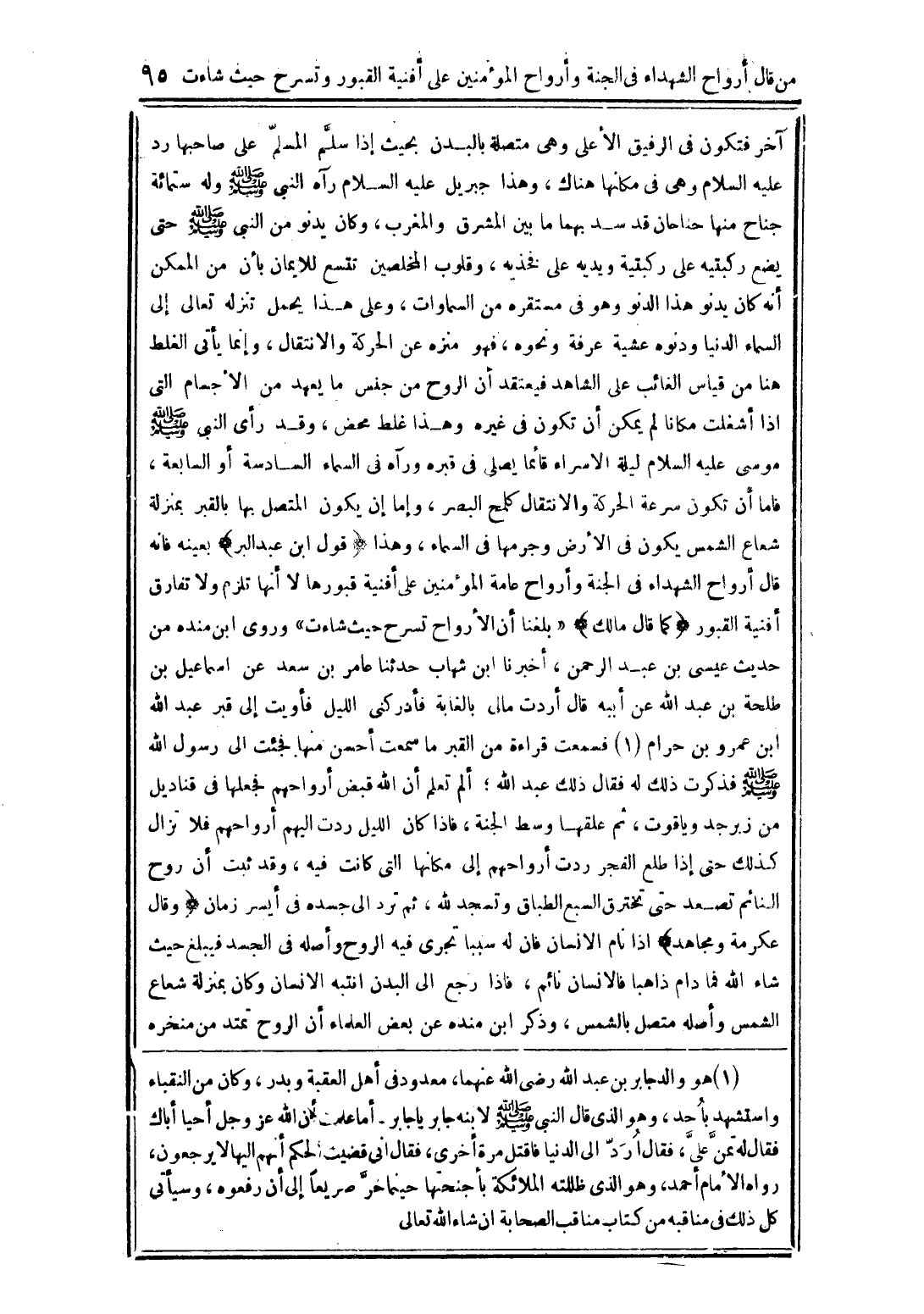 آخر فتكون في الرفيق الأعلى وهي متصلة بالبدن بحيث إذا سلَّم المسلَّم على صاحبها رد عليه السلام وهي في مكانها هناك، وهذا جبريل عليه السلام رآه النَّبيَّ صلَّى الله عليه وسلَّم وله ستمائة جناح منها جناحان قد يد بهما ما بين المشرق والمعرب، وكان يدنو من النَّبيَّ صلَّى الله عليه وسلَّم حتى يضع ركبتيه على ركبتيه ويديه على فخذيه، وقلوب المخلصين تتسع للايمان بأن من الممكن أنه كان يدنو هذا الدنو وهو في مستقره من السماوات، وعلى هذا يحمل تنزله تعالى إلى السماء الدنيا ودنوه عشية عرفة ونحوه، فهو منزه عن الحركة والانتقال، وإنما يأتي الغلط هنا من قياس الغائب عيى الشاهد فيعتقد أن الروح من جنس ما يعهد من الأجسام التي إذا اشغلت مكانا لم يمكن أن تكون في غيره وهذا غلط محض، وقد رأى النَّبيَّ صلَّى الله عليه وسلَّم موسى عليه السلام ليلة الاسراء قائمًا يصلي في قبره ورآه في السماء السادسة أو السابعة، فاما أن تكون سرعة الحركة والانتقال كلمح البصر، وإما أن يكون المتصل بها بالقبر بمنزلة شعاع الشمس يكون في الأرض وحرمها في السماء، وهذا (قول ابن عبد البر) بعينه فإنه قال أرواح الشهداء في الجنة وأرواح عامة المؤمنين على أفنية قبورها لا أنها لا تلزم ولا تفارق أفنية القبور (كما قال مالك) "بلغنا أن الأرواح تسرح حيث ئاءت" وروى ابن منده من حدث عيسى بن عبد الرحمن، أخبرنا بن شهاب حدثنا عامر بن سعد عن اسماعيل بن طلحة بن عبد الله عن أبيه قال أردت مالي بالغابة فأدركني الليل فأويت إلى قبر عبد الله ابن عمرو بن حرام (1) فسمعت قراءة من القبر ما سممعت أحسن منها فجئت إلى رسول الله صلَّى الله عليه وسلَّم فذكرت ذلك له فقال ذلك عبد الله؛ ألم تعلم أن الله قبض أرواحهم فجعلها في قناديل من زبرجد وياقوت، ثم علقها وسط الجنة، فإذا كان الليل ردت إليهم أرواحهم فلا تزال كذلك حتى إذا طلع الفجر ردت أرواحهم إلى مكانها التي كانت فيه، وقد ثبت أن روح النائم تصعد حتى تخترق السبع الطباق وتسجد لله، ثم ترد إلى جسده في أيسر زمان (وقال عكرمة ومجاهد) إذا نام الانسان فان له سببا تجري فيه الروح وأصله في الجسد فيبلغ حيث شاء الله فما دام ذاهبا فالانسان نائم، فاذا رجع إلى البدن انتبه الانسان وكان بمنزلة شعاع الشمس وأصله متصل بالشمس، وذكر ابن منده عن بعض العلماء أن الروح تمتد من منخره