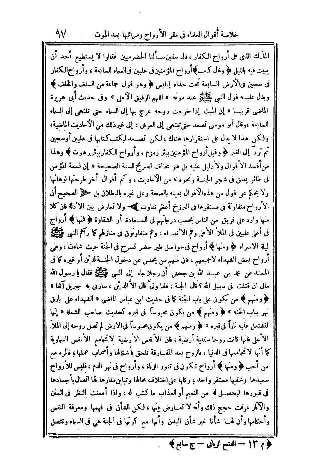الملك الذي على أرواح الكفار، قال سفين سألنا الحضرميين فقالوا لا يستطيع أحد أن يبيت فيه بالليل (وقال كعب) أرواح المؤمنين في عليين في السماء السابعة، وأرواح الكفار في سجين الأرض السابعة تحت حذاء إبليس (وهو قول جماعة من السلف والخلف) ويدل عليه قول النَّبيَّ صلَّى الله عليه وسلَّم عند موته "اللهم الرفيق الأعلى" وفي حديث أبي هريرة الماضي قريبا "إن الميت إذا خرجت روحه عرج بها إلى السماء حتى تنتهي إلى السماء حتى تنتهي إلى العرش، إلى غير ذلك من الأحاديث الماضية، ولكن هذا لا يدل على استقرارها هناك، لكن تصعد ليكتب كتابها في عليين أو سجين ثم ترد إلى القبر (وقيل أرواح المؤمنين ببئر زمزم، وأرواح الكفار ببئر برهوت) وهذا من أفسد الأقوال ولا دليل عليه بل هو مخالف لصريح السنة الصحيحة "إن نسمة المؤمن في طائر يعلق في شجر الجنة ونحوه، من الأحاديث، وثم أقوال أخر طرحتها لوهائها ولا يحكم على قول من هذه الأقوال بعينه بالصحة وعلى غيره بالبطلان بل (الصحيح أن الأرواح متفاوتة في مستقرها في البرزخ أعظم تفاوت) ولا تعارض بين الأدلة فإن كلا منها وارد على فريق من الناس بحسب درجاتهم في السعادة أو الشقاوة (فمنها) أرواح في أعلى عليين في الملأ الأعلى وهم الأنبياء، وهم متفاوتون في منازلهم كما رآهم النَّبيَّ صلَّى الله عليه وسلَّم ليلة الاسراء (ومنها) أرواح في حواصل طير خضر تسرح في الجنة حيث شاءت، وهي أرواح بعض الشهداء لا جمعيهم، فان منهم من يحبس عن دخول الجنة لدين أو غيره كما في المسند عن محمد بن عبد الله بن جحش أن رجلا جاء إلى النَّبيَّ صلَّى الله عليه وسلَّم فقال يا رسول الله مالي ان قتلت في سبيل الله؟ قال الجنة، فلما ولىًّ قال الًا الدين، سارني به جبريل آنفا" (ومنهم) من يكون على باب الجنة كما في حديث ابن عباس الماضي "الشهداء على بارق تهر بباب الجنة" (ومنهم) من يكون محبوسًا في قبره كحديث صاحب الشملة "إنها لتشتعل عليه نارًا في قبره" (ومنهم) من يكون محبوسًا في الارض لم تصل روحه إلى الملأ الأعلى فانها كانت روحا سفلية أرضية، فان الأنفس الأرضية لا تجامع الأنفس السماوية كما أنها لا تجامعها في الدنيا، فالروح بعد المفارقة تلحق بأشكالها وًاحاب عملها، فالمرء مع من أحب (ومنها) أرواح تكون في تنور الزناة، وأرواح في نهر الدم، فليس للأرواح سعيدها وشقيها مستقر واحد؛ وكلها على اختلاف محالها وتباين مقارها لها اتصال بأجسادها في قبورها ليحصل له من النعيم أو العذاب ما كتب له، واذا أمعنت النظر في السنن والآثار عرفت حجج ذلك وأنه لا تعارض بينها، لكن الشأن في فهمها ومعرفة النفس وأحكامها وأن لها شأنا غير شأن البدن وأنها مع كونها في الجنة هي في السماء وتتصل