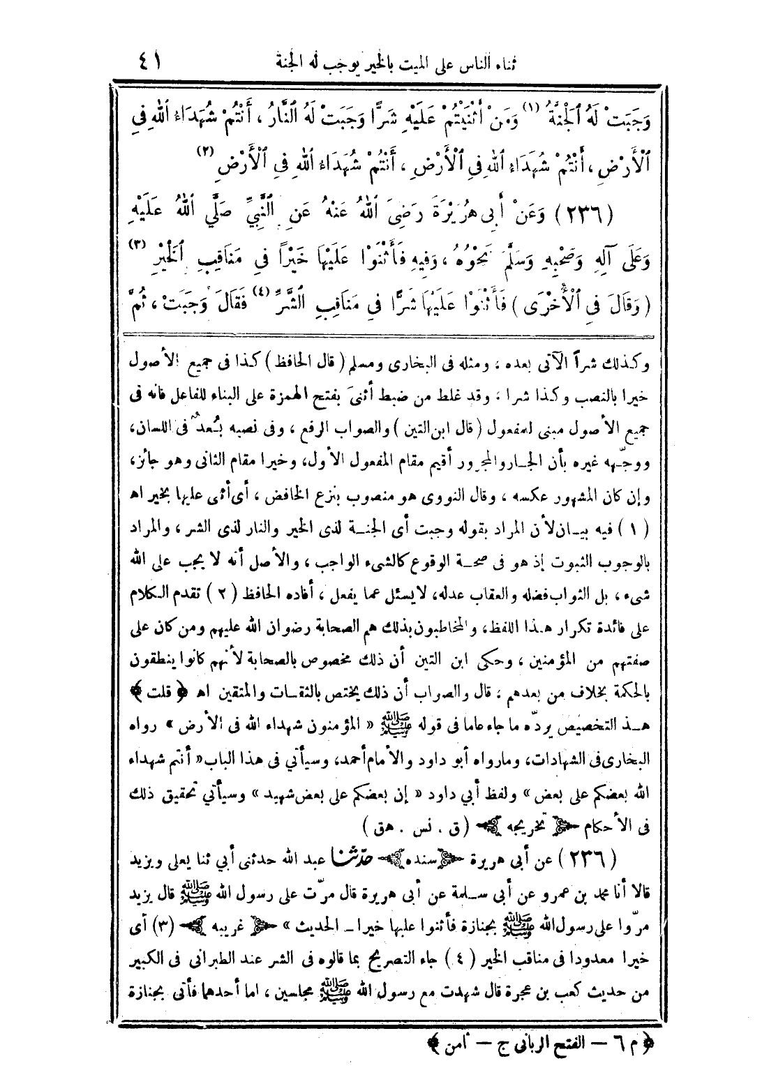(236) وعن أبي هريرة رضي الله عنه عن النبي صلى الله عليه وعلى آله وسلم نحوه، وفيه فأثنوا عليها خيرا في مناقب الخير (وقال في الأخرى) فأثنوا عليها شرا في مناقب الشر فقال وجبت، ثم
