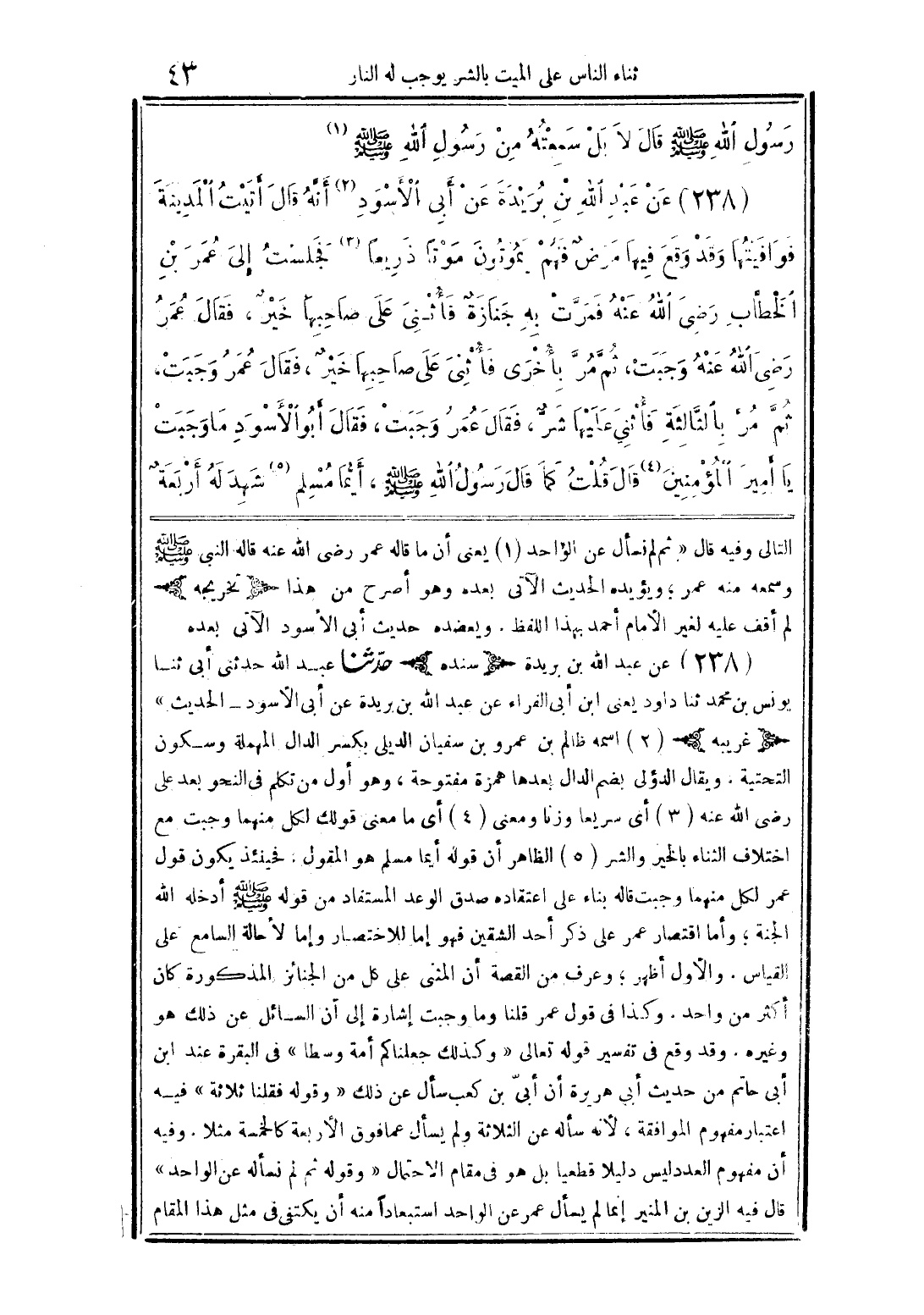 (238) عن عبدالله بن بريدة (سنده) حدثنا عبدالله حدثني أبي ثنا يونس بن محمد ثنا داود يعني ابن أبي الفراء عن عبدالله بن بريدة عن أبي الأسود - الحديث" (غريبه) (2) اسمه ظالم بن عمرو بن سفيان الديلي بكسر الدال المهملة وسكون التحتية. ويقال الدؤلي بضم الدال بعدها همزة مفتوحة، وهو أول من تكلم في النحو بعد علي رضي الله عنه (3) أي سريعا وزنا ومعنى (4) أي ما معنى قولك لكل منهما وجبت مع اختلاف الثناء بالخير والشر (5) الظاهر أن قوله أيما مسلم هو المقول. فحينئذ يكون قول عمر لكل منهما وجبت قاله بناء على اعتقاده صدق الوعد المستفاد من قوله صلى الله عليه وسلم أدخله الله الجنة؛ وأما اقتصار عمر على ذكر أحد الشقين فهو إما للاختصار وإما لإحالة السامع على القياس. والأول أظهر؛ وعرف من القصة أن الثمنى على كل من الجنائز المذكورة كان أكثر من الواحد. وكذا في قول عمر فلنا وما وجبت إشارة إلى أن السائل عن ذلك هو وغيره. وقد وقع في تفسير قوله تعالى "وكذلك جعلناكم أمة وسطا" في البقرة عند ابن أبي حاتم من حديث أبي هريرة أن أبي بن كعب سأل عن ذلك "وقوله فقلنا ثلاثة" وفيه اعبتار مفهوم الموافقة، لأنه سأله عن الثلاثة ولم يسأل عما فوق الاربعة كالخمسة مثلا. وفيه أن مفهوم العدد ليس دليلا قطعيا بل هو في مقام الاحتمال "وقوله ثم لم نسأله عن الواحد" قال فيه الزين بن المنير إنما لم يسأل عمر عن الواحد استبعادا منه أن يكتفي في مثل هذا المقام