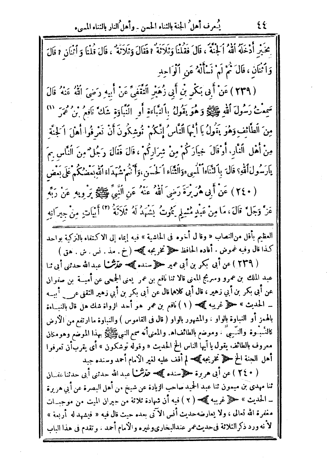 (239) عن أبي بكر بن أبي زهير الثقفي عن أبيه رضي الله عنه قال سمعت رسول الله صلى الله عليه وسلم وهو يقول بالنباءة أ, النباوة شك نافع بن عمر من الطائف وهو يقول يا أيها الناس إنكم توشكون أن تعرفوا أهل الجنة من أهل النار، أ, قال خياركم من شراركم، قال فقال رجل من الناس بم يا رسول الله، قال بالثناء المسئ والثناء الحسن، وأنتم شهداء الله بعضكم على بعض.