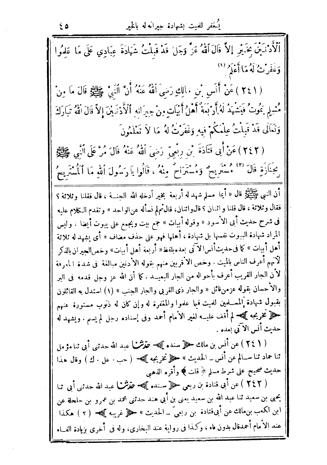 (241) عن أنس بن مالك (سنده) حدثنا عبدالله حدثني أبي ثنا مؤمل ثنا حماد ثنا سالم عن أنس - الحديث" (تخريجه) (حب. عل. ك) وقال هذا حديث صحيح على شروط مسلم (قلت) وأقره الذهبي.