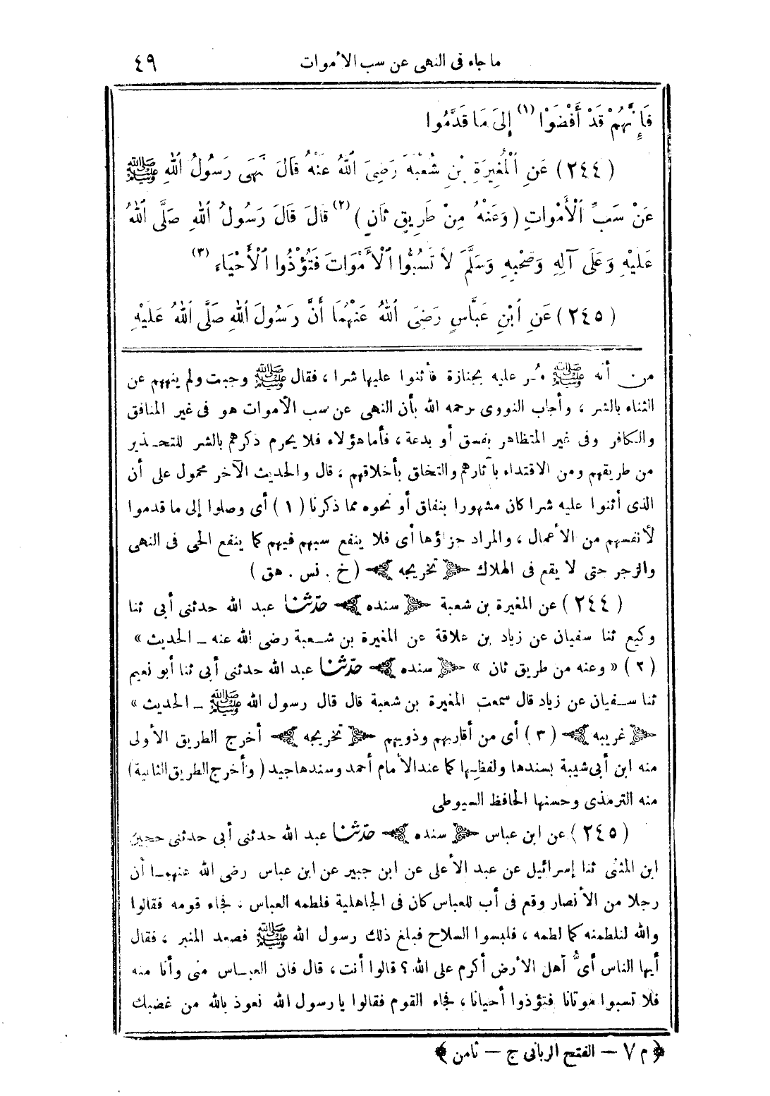 (244) عن المغيرة بن شعبة رضي الله عنه قال نهى رسول الله صلى الله عليه وسلم عن سب الأموات (وعنه من طريق ثان) قال قال رسول الله صلى الله عليه وعلى آله وصحبه وسلم لا تسبوا الأموات فتؤذوا الأحياء.