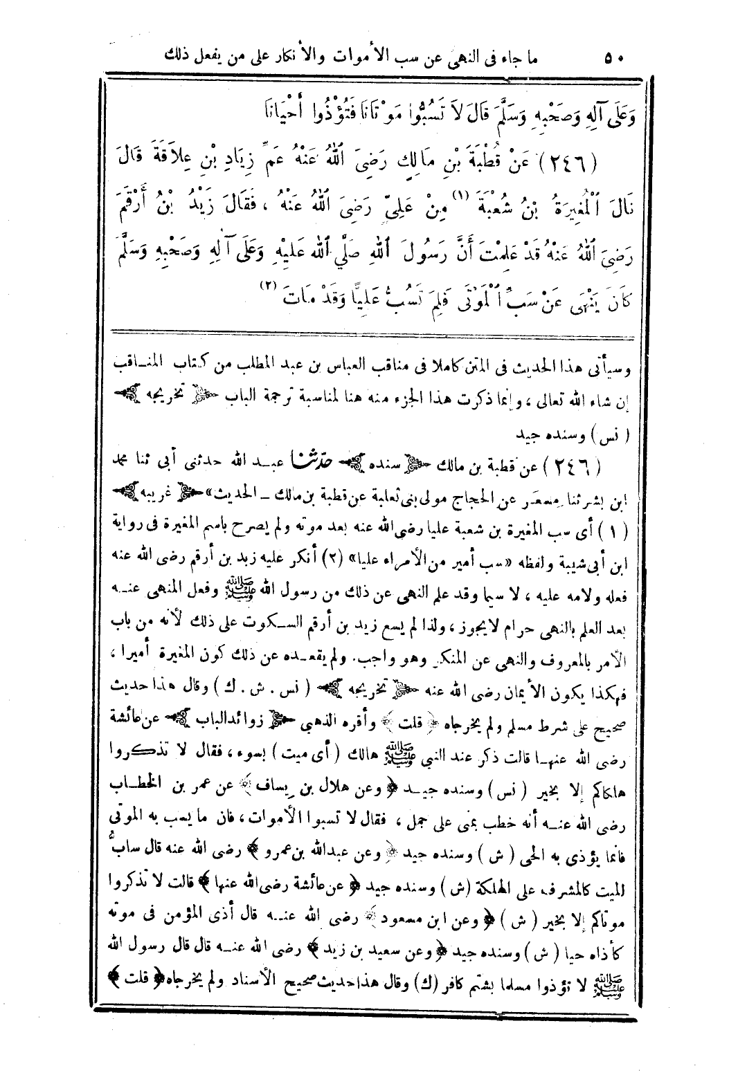 (246) عن قطبة بن مالك رضي الله عنه عم زياد بن علاقة قال نال المغيرة بن شعبة من على رضي الله عنه، فقال زيد بن أرقم رضي الله عنه قد علمت أن رسول الله صلى الله عليه وعلى آله وصحبه وسلم كان ينهي عن سب الموتى فلم تسب عليا وقد مات