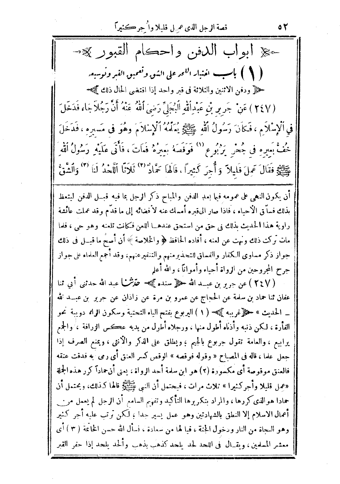 (247) عن جرير بن عبدالله البجلي رضي الله عنه أن رجلا جاء فدخل في الإسلام، فكان رسول الله صلى الله عليه وسلم يعلمه الإسلام وهو في مسيره، فدخل خف بعيره في جحر يربوع فوقصه بعيره فمات، فأتى عليه رسول الله صلى الله عليه وسلم فقال عمل قليلا وأجر كثيرا، قالها حماد ثلاثا اللحد لنا والشق