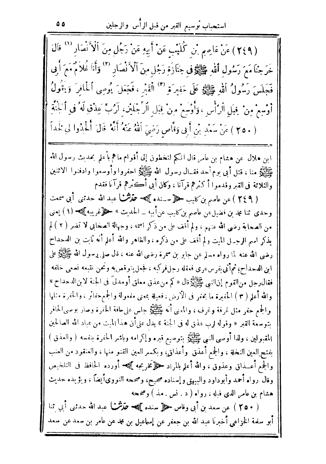 (249) عن عاصم بن كليب عن أبيه عن رجل من الأنصار قال خرجنا مع رسول الله صلى الله عليه وسلم في جنازة رجل من الأنصار وأنا غلام مع أبي فجلس رسول الله صلى الله عليه وسلم على حفيرة القبر، فجعل يوصي الحافر ويقول أوسع من قبل الرأس، وأوسع من قبل الرجلين، لرب عذق له في الجنة