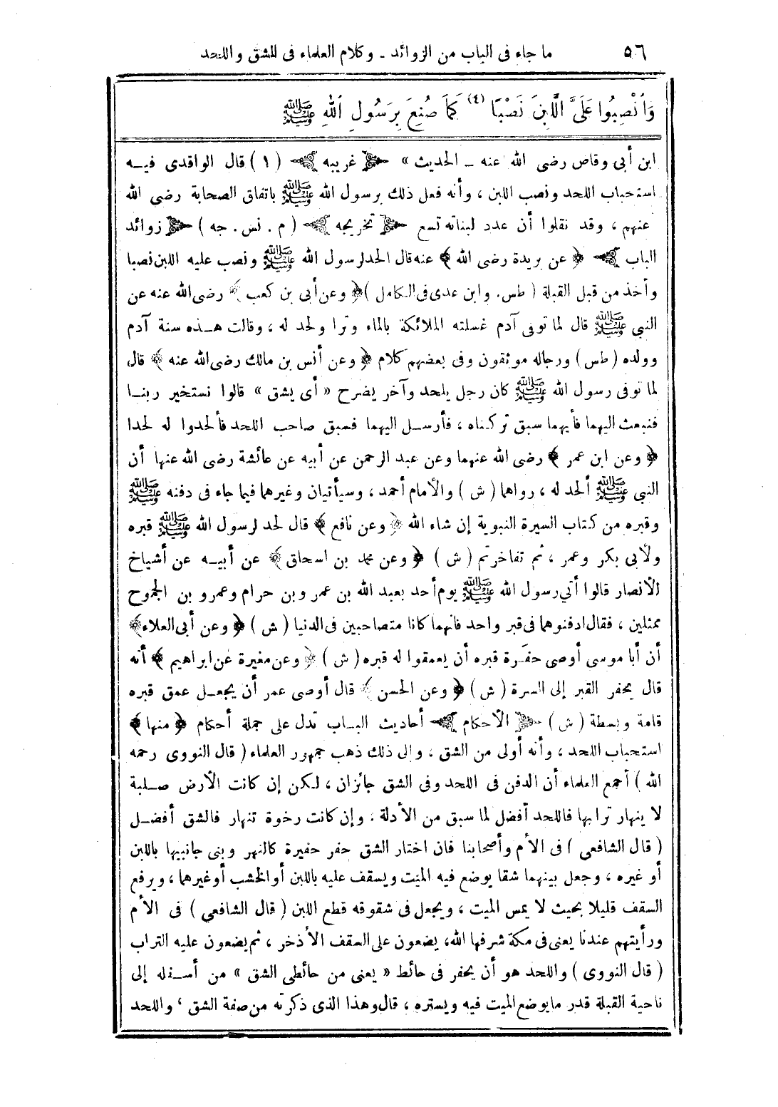 ابن أبي وقاص رضي الله عنه - الحديث" (غريبه) (1) قال الواقدي فيه استحباب اللحد ونصب اللبن، وأنه فعل ذلك برسول صلى الله عليه وسلم بإتفاق الصحابة رضي الله عنهم، وقد نقلوا أن عدد لبناته تسع (تخريجه) (م. نس. جه) (زوائد الباب) (عن بريدة رضي الله عنه) قال الحد لرسول الله صلى الله عليه وسلم صلى الله عليه وسلم ونصب عليه اللبن نصبا وأخذ من قبل القبلة (طس. وابن عدي في الكامل) (وعن أبي بن كعب) رضي الله عنه عن النبي صلى الله عليه وسلم قال لما توفى آدم غسلته الملائكة بالماء وترا ولحد له، وقالت هذه سنة آدم وولده (طس) ورجاله موثقون وفي بعضهم كلام (وعن أنس بن مالك رضي الله عنه) قال لما توفى رسول الله صلى الله عليه وسلم كان رجل يلحد وآخر يضرح) "أي يشق" قالوا نستخير ربنا فنبعث إليهما فأيهما سبق تركناه، فأرسل إليهما فسبق صاحب اللحد فألحدوا له لحدا (وعن ابن عمر) رضي الله عنهما وعن عبد الرحمن عن أبيه عن عائشة رضي الله عنها أن النبي صلى الله عليه وسلم ألحد له، رواهما (ش) والإمام أحمد، وسيأتيان وغيرهما فيما جاء في دفنه صلى الله عليه وسلم قبره ولأبي بكر وعمر، ثم تفاخرتم (ش) (وعن محمد بن اسحاق) عن أبيه عن أشياخ الأنصار قالوا أتى رسول الله صلى الله عليه وسلم يوم أحد بعبد الله بن عمر وبن حرام وعمرو بن الجموح ممثلين، فقال ادفنوهما في قبر واحد فإنهما كانا متصاحبين في الدنيا (ش) (وعن ابي العلاء) أن أبا موسى أوصيى حفرة قبره أن يعمقوا له قبره (ش) (وعن مغيرة عن إبراهيم) أنه قال يحفر القبر إلى السرة (ش) (وعن الحسن) قال أوصى عمر أن يجعل عمق قبره قامة وبسطة (ش) (الأحكام) أحاديث الباب تدل على جملة أحكام (منها) استحباب اللحد، وأنه أولى من الشق، وإلى ذلك ذهب جمهور العلماء (قال النووي رحمه الله) أجمع العلماء أن الدفن في اللحد وفي الشق جائزان، لكن إن كانت الأرض صلبة لا ينهار ترابها فاللحد أفضل لما سبق من الأدلة. وإن كانت رخوة تنهار فالشق أفضل (قال الشافعي) في الأم وأصحابنا فإن اختار الشق حفر حفيرة كالنهر وبني جانبيها باللبن أو غيره، وجعل بينهما شقا يوضع فيه الميت ويسقف عليه اللبن أو الخشب أو غيرهما، ويرفع السقف قليلا بحيث لا يمس الميت، ويجعل في شقوقه قطع اللبن (قال الشافعي) في الأم ورأيتهم عندنا يعني في مكة شرفها الله، يضعون على السقف الأذخر، ثم يضعون عليه التراب (قال النووي) واللحد هو أن يحفر في حائط "يعني من حائطي الشق" من أسفله إلى ناحية القبلة قدر ما يوضع الميت فيه ويستره، قال وهذا الذي ذكرته من صفة الشق، واللحد