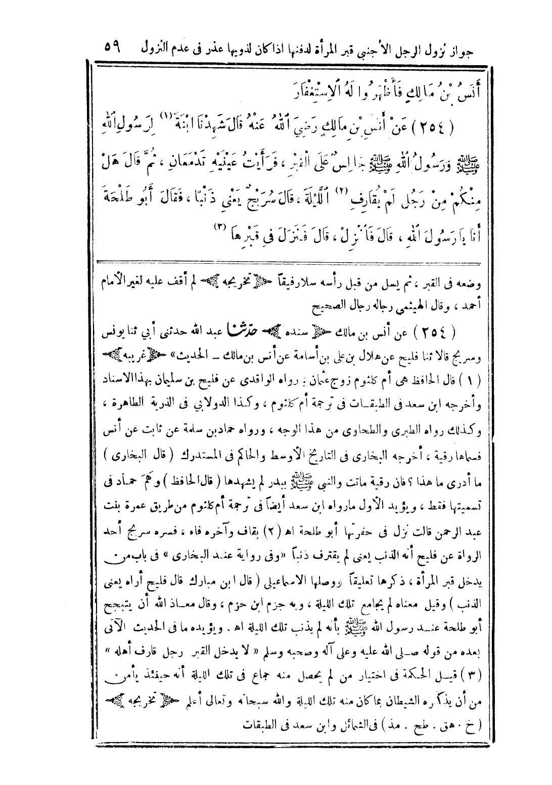 (254) عن أنس بن مالك رضي الله عنه قال شهدنا ابنة لرسول الله صلى الله عليه وسلم ورسول الله صلى الله عليه وسلم جالس عل القبر، فرأيت عينيه تدمعان، ثم قال هل منكم من رجل لم يقارف الليلة، قال سربج يعني ذنبا، فقال أبو طلحة أنا يا رسول الله، قال فانزل، قال فنزل في قبرها