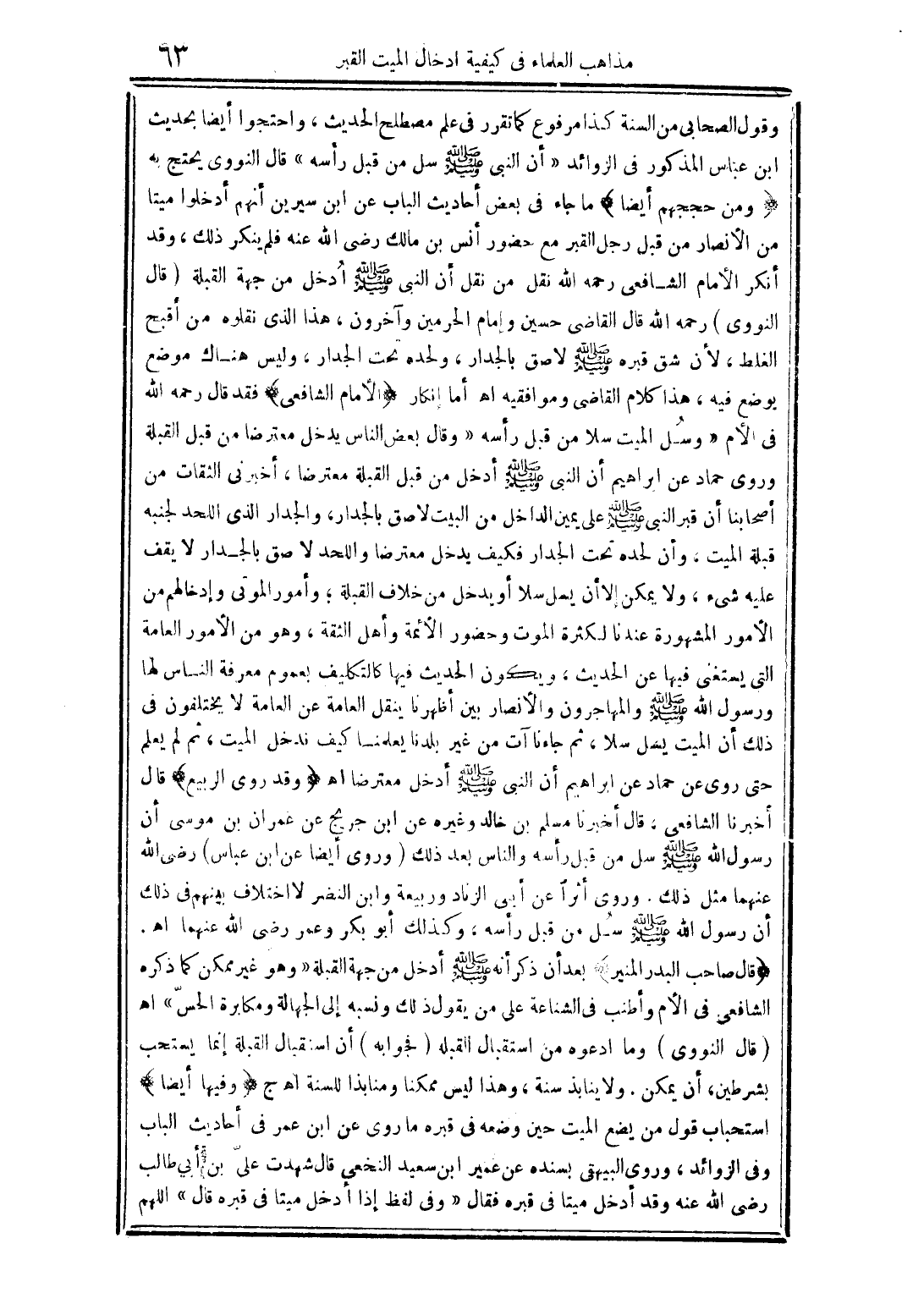 وقول الصحابي بيمن السنة كذا مرفوع كما نقرر في علم مصطلح الحديث، واحتجوا أيضا بحديث ابن عباس المذكور في الزوائد "أن النبي صلى الله عليه وسلم سل من قبل رأسه" قال النووي يحتج (ومن حججهم أيضا) ما جاء في بعض أحاديث الباب عن ابن سيرين أنهم أدخلوا ميتا من الأنصار من قبل رجل القبر مع حضور أنس بن مالك رضي الله عنه لم ينكر ذلك، وقد أنكر الإمام الشافعي رحمه الله نقل من نقل أن النبي صلى الله عليه وسلم أدخل من جهة القبلة (قال النووي) رحمه الله قال القاضي حسين وإمام الحرمين وآخرون، هذا الذي نقلوه من أقبح الغلط، لأن شق قبره صلى الله عليه وسلم لاصق بالجدار، ولحده تحت الجدار، وليس هناك موضع يوضع فيه، هذا كلام القاضي وموافقيه أهـ أما إنكار (الإمام الشافعي) فقد قال رحمه الله في الأم "وسل الميت سلا من قبل رأسه "وقال بعض الناس يدخل معترضا من قبل القبلة وروى حماد عن إبراهيم أن النبي صلى الله عليه وسلم أدخل من قبل القبلة معترضا، أخبرني الثقات من أصحابنا أن قبر النبي صلى الله عليه وسلم على يمين الداخل من البيت لاصق بالجدار، والجدار الذي اللحد لجنبه قبلة الميت، وأن لحده تحت الجدار فكيف يدخل معترضا واللحد لاصق بالجدار لا يقف عليه شيء، ولا يمكن إلا أن يسل سلا أو يدخل من خلاف القبلة، وأمور الموتى وإدخالهم من الأمور المشهورة عندنا لكثرة الموت وحضور الأئمة وأهل الثقة، وهو من الأمور العامة التي يستغني فيها عن الحديث، ويكون الحديث فيها كالتكليف بعموم معرفة الناس لها ورسول الله صلى الله عليه وسلم والمهاجرون والأنصار بين أظهرنا ينقل العامة عن العامة لا يختلفون في ذلك أن الميت يسل سلا، ثم جاءنا آت من غير بلدنا يعلمنا كيف ندخل الميت، ثم لم يعلم حتى روى عن حماد عن إبراهيم أن النبي صلى الله عليه وسلم أدخل معترضا أهـ (وقد روى الربيع) قال أخبرنا الشافعي، قال أخبرنا مسلم بن خالد وغيره عن ابن جريح عن عمران بن موسى أن رسول الله صلى الله عليه وسلم سل من قبل رأسه والناس بعد ذلك (وروى أيضا عن ابن عباس) رضي الله عنهما مثل ذلك. وروى أثرا عن أبي الزناد وربيعة وابن النضر لا اختلاف بينهم في ذلك أن رسول الله صلى الله عليه وسلم سل من قبل رأسه، وكذلك أبو بكر وعمر رضي الله عنهما أهـ (قال صاحب البدر المنير) بعد أن ذكر أنه صلى الله عليه وسلم أدخل من جهة القبلة "وهو غير ممكن كما ذكره الشافعي في الأم وأطنب في الشناعة على من يقول ذلك ونسبه إلى الجهالة ومكابرة الحس" أهـ (قال النووي) وما ادعوه من استقبال القبلة (فجوابه) أن استقبال القبلة إنما يستحب بشرطين، أن يمكن، ولا ينابذ سنة، وهذا ليس ممكنا ومنابذا للسنة أهـ ج (وفيها أيضا) استحباب قول من يضع الميت حين وضعه في قبره ما روى عن ابن عمر في أحاديث الباب وفي الزوائد، وروى البيهقي بسنده عن عمير ابن سعيد النخعي قال شهدت علي بن أبي طالب رضي الله عنه وقد أدخل ميتا في قبره فقال "وفي لفظ إذا أدخل ميتا في قبره قال" اللهم