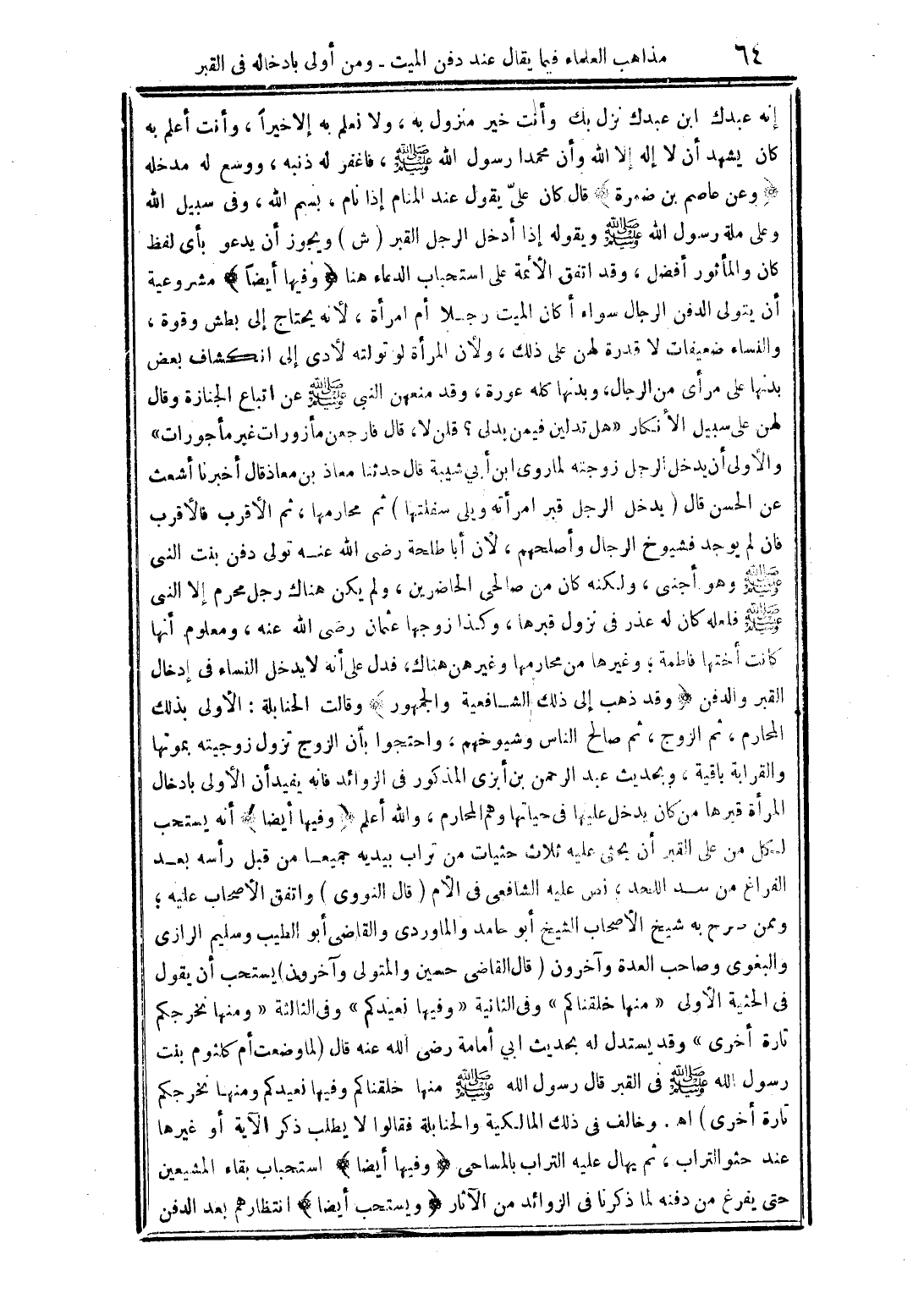 إنه عبدك ابن عبدك نزل بك وأنت خير منزول به، ولا نعلم به إلا خيرا، وأنت أعلم به كان يشهد أن لا إله إلا الله وأن محمدا رسول الله صلى الله عليه وسلم، فاغفر له ذنبه، ووضع له مدخله (وعن عاصم بن ضمرة) قال كان علي يقول عند المنام إذا نام، بسم الله، وفي سبيل الله وعلى ملة رسول الله صلى الله عليه وسلم ويقوله ويقوله إذا أدخل الرجل القبر (ش) ويجوز أن يدعو بأي لفظ كان والمأثور أفضل، وقد اتفق الأئمة على استحباب الدعاء هنا (وفيها أيضا) مشروعية أن يتولى الدفن الرجال سواء أكان الميت رجلا أم امرأة، لأنه يجتاج إلى بطش وقوة، والنساء ضعيفات لا قدرة لهن على ذلك، ولأن المرأة لو تولته لأدى إلى انكشاف بعض بدنها على مرأى من الرجال، وبدنها كله عورة، وقد منعهن النبي صلى الله عليه وسلم عن اتباع الجنازة وقال لهن على سبيل المثال الأنكار "هل تدلين فيمن يدلي؟ قلن لا، قال فارجعهن مأزورات غير مأجورات" والأولى أن يدخل الرجل زوجته لما روى ابن شيبة قال حدثنا معاذ بن معاذ قال أخبرنا أشعث عن الحسن قال (يدخل الرجل قبر امرأته ويلي سفلتها) ثم محارمها، ثم الأقرب فالأقرب فإن لم يوجد فشيوخ الرجال وأصلحهم لأن أبا طلحة رضي الله عنه تولى دفن بنت النبي صلى الله عليه وسلم وهو أجنبي، ولكنه كان من صالحي الحاضرين، ولم يكن هناك محرم إلا النبي صلى الله عليه وسلم فلعله كان له عذر في نزول قبرها، وكذا زوجها عثمان رضي الله عنه، ومعلوم أنها كانت أختها فاطمة، وغيرها من محارمها وغيرهن هناك، فدل على أنه لا يدخل النساء في إدخال القبر والدفن (وقد ذهب إلى ذلك الشافعية والجمهور) وقالت الحنابلة: الأولى بذلك المحارم، ثم الزوج ثم صالح الناس وشيوخهم، واحتجوا بأن الزواج تزول زوجيته بموتها والقرابة باقية، وبحديث عبد الرحمن بن أبزي المذكور في الزوائد فإنه يفيد أن الأولى بإدخال المرأة قبرها من كان يدخل عليها في حياتها وهم المحارم، والله أعلم (وفيها أيضا) أنه يستحب لكل من على القبر أن يحثي عليه ثلاث حثيات من تراب بيديه جميعا من قبل رأسه بعد الفراغ من سد اللحد، قص عليه الشافعي في الأم (قال النووي) واتفق الأصحاب عليه، وممن صرح به شيخ الأصحاب الشيخ أبو حامد والمارودي والقاضي أبو الطيب وسليم الرازي والبغوي وصاحب العدة وآخرون (قال القاضي حسين والمتولي وآخرون) يستحب أن يقول في الحثية الأولى "منها خلقناكم" وفي الثانية "وفيها نعيدكم" وفي الثالثة "ومنها نخرجكم تارة أخرى" وقد يستدل له بحديث أبي أمامة رضي الله عنه قال (لما وضعت أم كلثوم بنت رسول الله صلى الله عليه وسلم في القبر قال رسول الله صلى الله عليه وسلم منها خلقناكم وفيها نعيدكم ومنها نخرجكم تارة أخرى) أهـ. وخالف في ذلك المكلية والحنابلة فقالوا لا يطلب ذكر الآية أو غيرها عند حثو التراب، ثم يهال عليه التراب بالمساحي (وفيها أيضا) استحباب بقاء المشيعين حتى يفرغ من دفنه لما ذكرنا في الزوائد من الآثار (ويستحب ايضا) انتظارهم بعد الدفن
