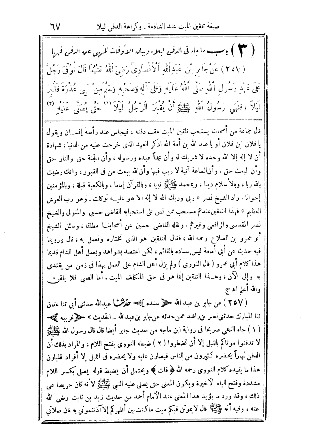 (257) عن جابر بن عبد الله الأنصاري رضي الله عنهما قال توفى رجل على عبد رسول الله صلى الله عليه وعلى آله وصحبه وسلم من بني عذرة فقبر ليلا، فنهى رسول الله صلى الله عليه وسلم أ، يقبر الرجل ليلا حتى يصلى عليه