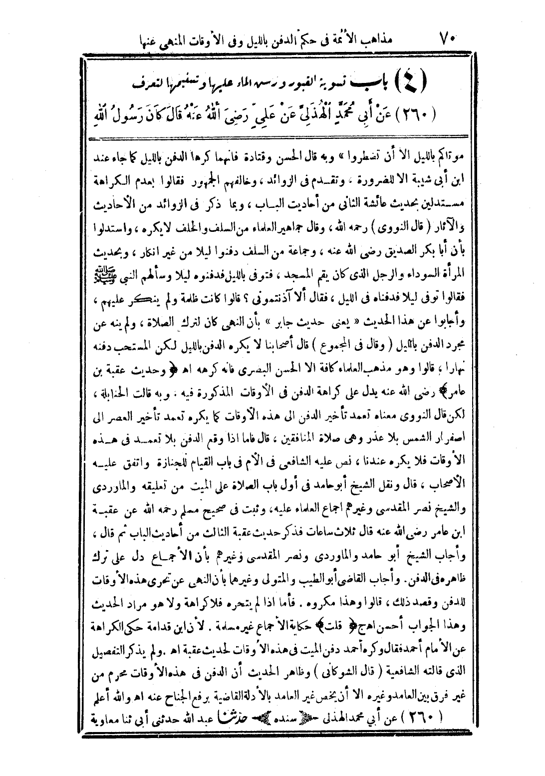 موتاكم بالليل إلا أن تضطروا" وبه قال الحسن وقتادة فإنهما كرها الدفن بالليل كما جاء عند ابن أبي شيبة إلا للضرورة، وتقدم في الزوائد، وخالفهم الجمهور فقالوا بعدم الكراهة مستدلين بحديث عائشة الثاني من أحاديث الباب، وبما ذكر في الزوائد من الأحاديث والآثار (قال النووي) رحمه الله، وقال جماهير العلماء من السلف فدفنوا ليلا من غير إنكار، وبحديث المرأة السوداء والرجل الذي كان يقم المسجد، فتوفى بالليل فدفنوه ليلا وسألهم النبي صلى الله عليه وسلم فقالوا توفى ليلا فدفناه في الليل، فقال ألا آذنتموني؟ قالوا كانت ظلمة ولم ينكر عليهم، وأجابوا عن هذا الحديث "يعني حديث جابر" بأن النهي كان لترك الصلاة، ولم ينه عن مجرد الدفن بالليل (قال في المجموع) قال أصحابنا لا يكره الدفن بالليل لكن المستحب دفنه نهارا، قالوا وهو مذهب العلماء كافة إلا الحسن البصري فإنه كرهه أهـ (وحديث عقبة بن عامر) رضي الله عنه يدل على كراهة الدفن في الأوقات المذكورة فيه، وبه قالت الحنابلة، لكن قال النووي معناه تعمد تأخير الدفن إلى هذه الأوقات كما يكره تعمد تأخير العصر إلى اصفرار الشمس بلا عذر وهي صلاة المنافقين، قال فإما إذا وقع الدفن بلا تعمد في هذه الأوقات فلا يكره عندنا، نص عليه الشافعي في الأم في باب القيام للجنازة واتفق عليه الأصحاب، قال ونقل الشيخ أبو حامد في أول باب الصلاة على الميت من تعليقه والماوردي والشيخ نصر المقدسي وغيرهم اجماع العلماء عليه، وثبت في صحيح مسلم رحمه الله عن عقبة ابن عامر رضي الله عنه قال ثلاث ساعات فذكر حديث عقبة الثالث من أحاديث الباب ثم قال وأجاب الشيخ أبو حامد والماوردي ونصر المقدسي وغيرهم بأن الإجماع دل على ترك ظاهره في الدفن. وأجاب القاضي أبو الطيب والمتولي وغيرهما بأن النهي عن تحري هذه الأوقات للدفن وقصد ذلك، قالوا وهذا مكروه، فأما إذا لم يتحره فلا كراهة ولا هو مراد الحديث وهذا الجواب أحسن أهـ ج (قلت) حكاية الإجماع غير مسلمة، لأن ابن قدامة حكى الكراهة عن الإمام أحمد فقال وكره أحمد دفن الميت في هذه الأوقات لحديث عقبة أهـ. ولم يذكر التفصيل الذي قالته الشافعية (قال الشوكاني) وظاهر الحديث أن الدفن في هذه الأوقات محرم من غير فرق وبين العامد وغيره إلا أن يخص غير العامد بالأدلة القاضية برفع الجناح عنه أهـ والله أعلم