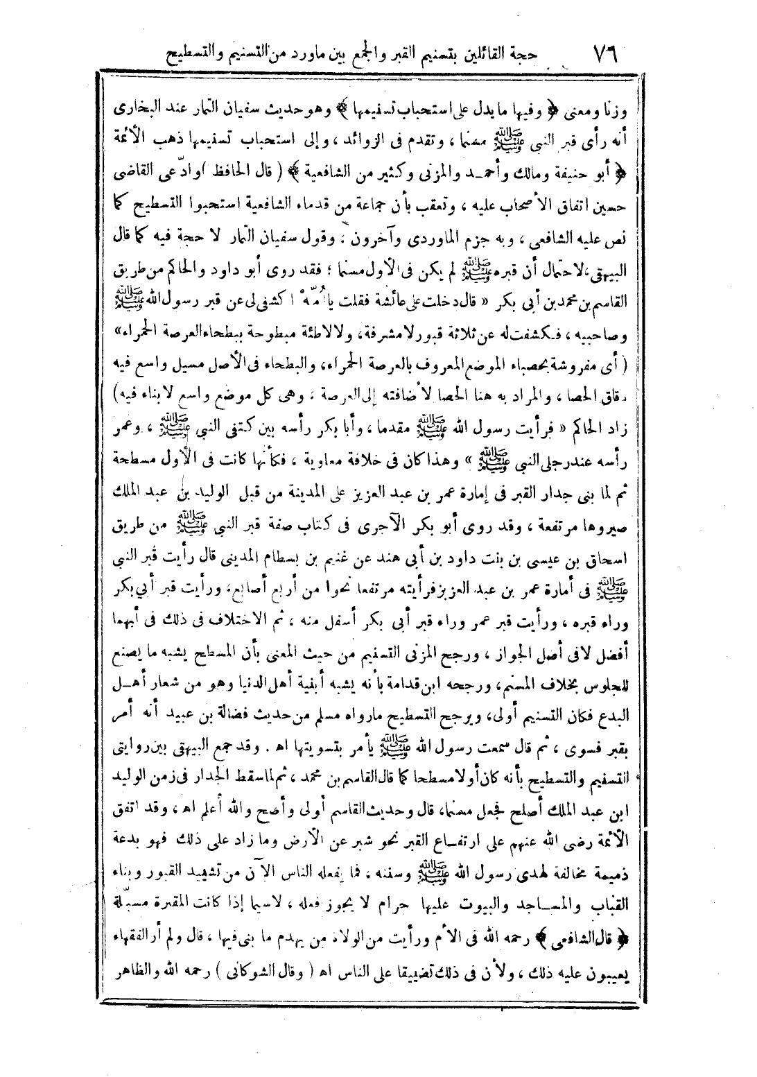 وزنا ومعنى (وفيها ما يدل على استحباب تسميتها) وهو حديث سفيان الثمار عند البخاري أنه رأي قبر النبي صلى الله عليه وسلم مسنما، وتقدم في الزوائد، وإلى استحباب تسنيمها ذهب الأئمة (أبو حنيفة ومالك وأحمد والمزني وكثير من الشافعية) (قال الحافظ وادعى القاضي حسين اتفاق الأصحاب عليه، وتعقب بأن جماعة من قدماء الشافعية استحبوا التسطيح كما نص عليه الشافعي، وبه جزم الماوردي وآخرون، وقول سفيان التمار لا حجة فيه كما قال البيهقي، لاحتمال أن قبره صلى الله عليه وسلم لم يكن في الأول مسنما؛ فقد روى أبو داود والحاكم من طريق القاسم بن محمد بن أبي بكر "قال دخلت على عائشة فقلت يا أمه، اكشفي لي عن قبر رسول الله صلى الله عليه وسلم وصاحبيه، فكشفت له عن ثلاثة قبور لا مشرفة، ولا لاطئة مبطوحة ببطحاء العرضة الحمراء" (أي مفروشة بحصباء الموضع المعروف بالعرضة الحمراء، والبطحاء في الأصل مسيل واسع فيه دقاق الحصا، والمراد به هنا الحصا لإضافته إلى العرضة، وهي كل موضع واسع لا بناء فيه) زاد الحاكم "فرأيت رسول الله صلى الله عليه وسلم مقدما، وأبا بكر رأسه بين كتفي النبي صلى الله عليه وسلم، وعمر رأسه عند رجلي النبي صلى الله عليه وسلم" وهذا كان في خلافة معاوية، فكأنها كانت في الأول مسطحة ثم لما بني جدار القبر في إمارة عمر بن عبد العزيز على المدينة من قبل الوليد بن عبد الملك صيروها مرتفعة، وقد روى أبو بكر الآجري في كتاب صفة قبر النبي صلى الله عليه وسلم من طريق اسحاق بن عيسى عن بنت داود بن أبي هند عن غنيم بن بسطام المديني قال رأيت قبر النبي صلى الله عليه وسلم في أمارة عمر بن عبد العزيز فرأيته مرتفعا نحوا من اربع أصابع، ورأيت قبر أبي بكر وراء قبره، ورايت قبر عمر وراء قبر أبي بكر اسفل منه، ثم الاختلاف في ذلك في أيهما أفضل لافي أصل الجواز، ورجع المزني التسنيم من حيث المعني بأن المسطح يشبه ما يصنع للجلوس بخلاف المسنم، ورجحه ابن قدامة بأنه يشبه أبنية أهل الدنيا وهو من شعار أهل البدع فكان التسنيم أولى، ويرجح التسطيح ما رواه مسلم من حديث فضالة بن عبيد أنه مر بقبر فسوي، ثم قال سمعت رسول الله صلى الله عليه وسلم يأمر بتسويتها أهـ وقد جمع البيهقي بين روايتي التسنيم والتسطيح بأنه كان أولا مسطحا كما قال القاسم بن محمد، ثم لما سقط الجدار في زمن الوليد ابن عبد الملك أصلح فجعل مسنما، قال وحديث القاسم أولى وأصح والله أعلم أهـ، وقد اتفق الأئمة رضى الله عنهم على ارتفاع القبر نحو شبر عن الأرض ومازاد على ذلك فهو بدعة ذميمة مخالفة لهدي رسول الله صلى الله عليه وسلم وسننه، فما يفعله الناس الآن من تشييد القبور وبناء القباب والمساجد والبيوت عليها حرام لا يجوز فعله، لا سيما إذا كانت المقبرة مسبلة (قال الشافعي) رحمه الله في الأم ورأيت من الولاء من يهدم ما بنى فيها، قال ولم أر الفقهاء يعيبون عليه ذلك، ولأن في ذلك تضييقا على الناس أهـ (وقال الشوكاني) رحمه الله والظاهر
