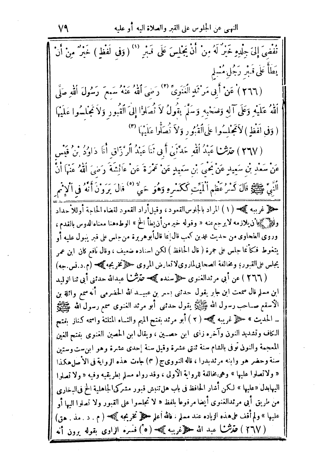 (266) عن أبي مرثد الغنوي رضى الله عنه سمع رسول الله صلى الله عليه وعلى آله وصحبه وسلم يقول لا تصلوا إلى القبور ولا تجلسوا عليها (وفي لفظ) لا تجلسوا على القبور ولا تصلوا عليها.