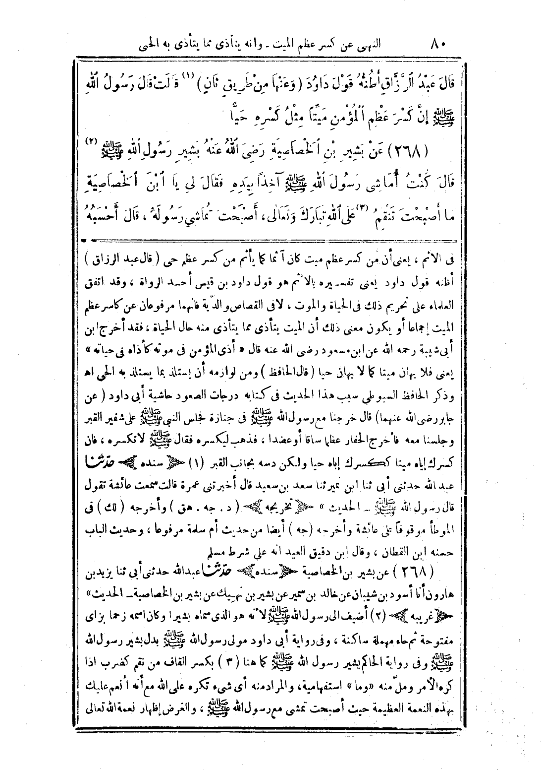 في الإثم، يعني أن من كسر عظم ميت كان آثما كما يأثم كم كسر عظم الحي (قال عبد الرزاق) أظنه قول داود يعني تفسيره بالإثم هو قول داود بن قيس أحد الرواة، وقد اتفق العلماء على تحريم ذلك في الحياة والموت، لافي القصاص والدية فإنهما مرفوعان عن كاسر عظم الميت إجماعا أو يكون معنى ذلك أن الميت يتأذى مما يتأذى منه حال الحياة، فقد اخرج ابن شيبة رحمه الله عن ابن مسعود رضي الله عنه قال "أذى المؤمن في موته كأذاه في حياته" يعني فلا يهان ميتا كما لا يهان حيا (قال الحافظ) ومن لوازمه أن يستلذ بما يستلذ به الحي أهـ وذكر الحافظ السيوطي سبب هذا الحديث في كتابه درجات الصعود حاشية أبي داود (عن جابر رضي الله عنهما) قال خرجنا مع رسول الله صلى الله عليه وسلم في جنازة فجلس النبي صلى الله عليه وسلم على شفير القبر وجلسنا معه فأخرج الحفار عظما ساقا أو عضدا، فذهب ليكسره فقال صلى الله عليه وسلم لا تكسره، فإن كسرك إياه ميتا ككسرك إياه حيا ولكن دسه بجانب القبر (1) (سنده) حدثنا عبدالله حدثني أبي ثنا ابن نمير ثنا سعد بن سعيد قال أخبرتني عمرة قال سمعت عائشة تقول قال رسول الله صلى الله عليه وسلم - الحديث" (تخريجه) (د. جه. هق) أخرجه (لك) في الموطأ موقوفا على عائشة وأخرجه (جه) أيضا من حديث أم سلمة مرفوعا، وحديث الباب حسنه ابن القطان، وقال ابن دقيق العيد أنه على شروط مسلم.