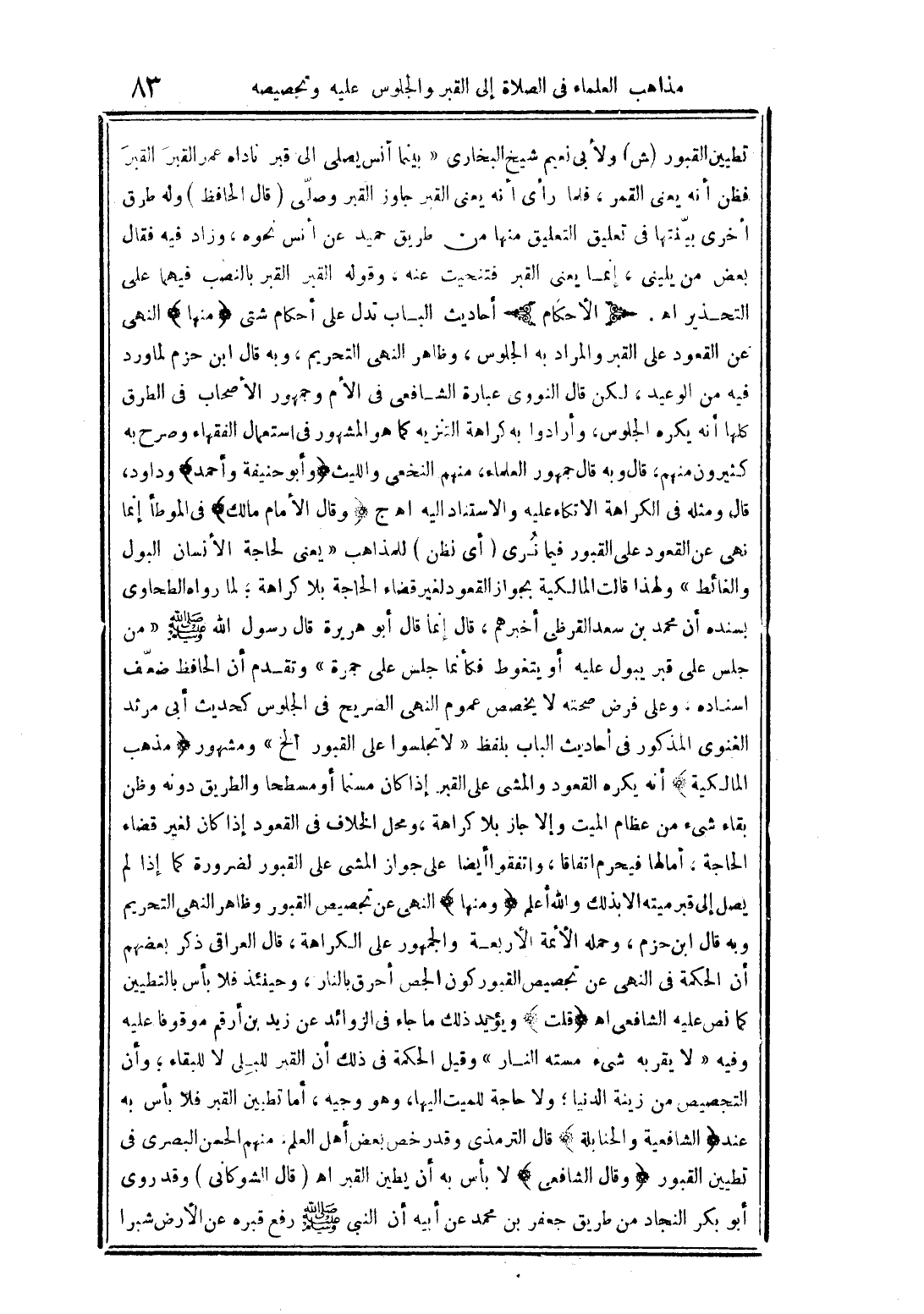 تطيين القبور (ش) ولأبي نعيم شيخ البخاري "بينما أنس يصلي إلى قبر ناداه عمر القبر القبر فظن أنه يعني القمر، فلما رأى أنه يعني القبر تجاوز القبر وصلى (قال الحافظ) وله طرق أخرى بينتها في تعليق التعليق منها من طريق حميد عن أنس نحوه، وزاد فيه فقال بعض من يلبني، إنما يعني القبر فتنحيت عنه، وقوله القبر القبر بالنصب فيهما على التحذير أهـ (الأحكام) أحاديث الباب تدل على أحكام شتى (منها) النهي عن القعود على القبر والمراد به الجلوس، وظاهر النهي التحريم، وبه قال ابن حزم لماورد فيه من الوعيد، لكن قال النووي عبارة الشافعي في الأم وجمهور الأصحاب في الطرق كلها أنه يكره الجلوس، وأرادوا به كراهة التنزيه كما هو المشهور في استعمال الفقهاء وصرح به كثيرون منهم، قال عبارة الشافعي في الأم وجمهور الأصحاب في الطرق كلها أن يكره الجلوس، وأرادوا به كراهة التنزيه كما هو المشهور في استعمال الفقهاء وصرح به كثيرون منهم، قال وبه قال جمهور العلماء، منهم النخعي والليث (وأبو حنيفة وأحمد) وداود، قال ومثله في الكراهة الاتكاء عليه والاستناد إليه أهـ ج (قال الإمام مالك) في الموطأ إنما نهى عن القعود على القبور فيما نرى (أي نظن) للمذاهب "يعني لحاجة الإنسان البول والغائط" ولهذا قالت المالكية بجواز القعود لغير قضاء الحاجة بلاكراهة؛ لما رواه الطحاوي بسنده أن محمد بن سعد القرظي أخبرهم، قال إنما قال أبو هريرة قال رسول الله صلى الله عليه وسلم "من جلس على قبر يبول عليه أو يتغوط فكأنما جلس على جمرة" وتقدم أن الحافظ ضعف اسناده. وعلى فرض صحته لا يخصص عموم النهي الصريح في الجلوس كحديث أبي مرثد الغنوي المذكور في أحاديث الباب بلفظ "لا تجلسوا على القبور الخ" ومشهور (مذهب المالكية) أنه يكره القعود والمشي على القبر إذا كان مسنما أو مسطحا والطريق دونه وظن بقاء شيء من عظام الميت وإلا جاز بلا كراهة، ومحل الخلاف في القعود إذا كان لغير قضاء الحاجة، أمالها فيحرم اتفاقا، واتفقوا أيضا على جواز المشي على القبور لضرورة كما إذا لم يصل إلى قبر ميته إلا بذلك والله أعلم (منها) النهي عن تجصيص القبور وظاهر النهي التحريم وبه قال ابن حزم، وحمله الأئمة الأربعة والجمهور على الكراهة، قال العراقي ذكر بعضهم أن الحكمة في النهي عن تجصيص القبور كون الجص أحرق بالنار، وحينئذ فلا بأس بالتطبيق كما نص عليه الشافعي أهـ (قلت) ويؤيد ذلك ما جاء في الزوائد عن زيد بن أرقم موقوفا عليه وفيه "لا يقربه شئ مسته النار" وقيل الحكمة في ذلك أن القبر للبلى لا للبقاء؛ وأن التجصيص من زينة الدنيا؛ ولا حاجة للميت إليها، وهو وجيه، أما تطيين القبر فلا بأس به عند (الشافعية والحنابلة) قال الترمذي وقد رخص بعض أهل العلم. منمه الحسن البصري في تطيين القبور (وقال الشافعي) لا بأس به أن يطين القبر أهـ (قال الشوكاني) وقد روى أبو بكر النجاد من طريق جعففر بن محمد عن أبيه أن النبي صلى الله عليه وسلم رفع قبره عن الأرض شبرًا