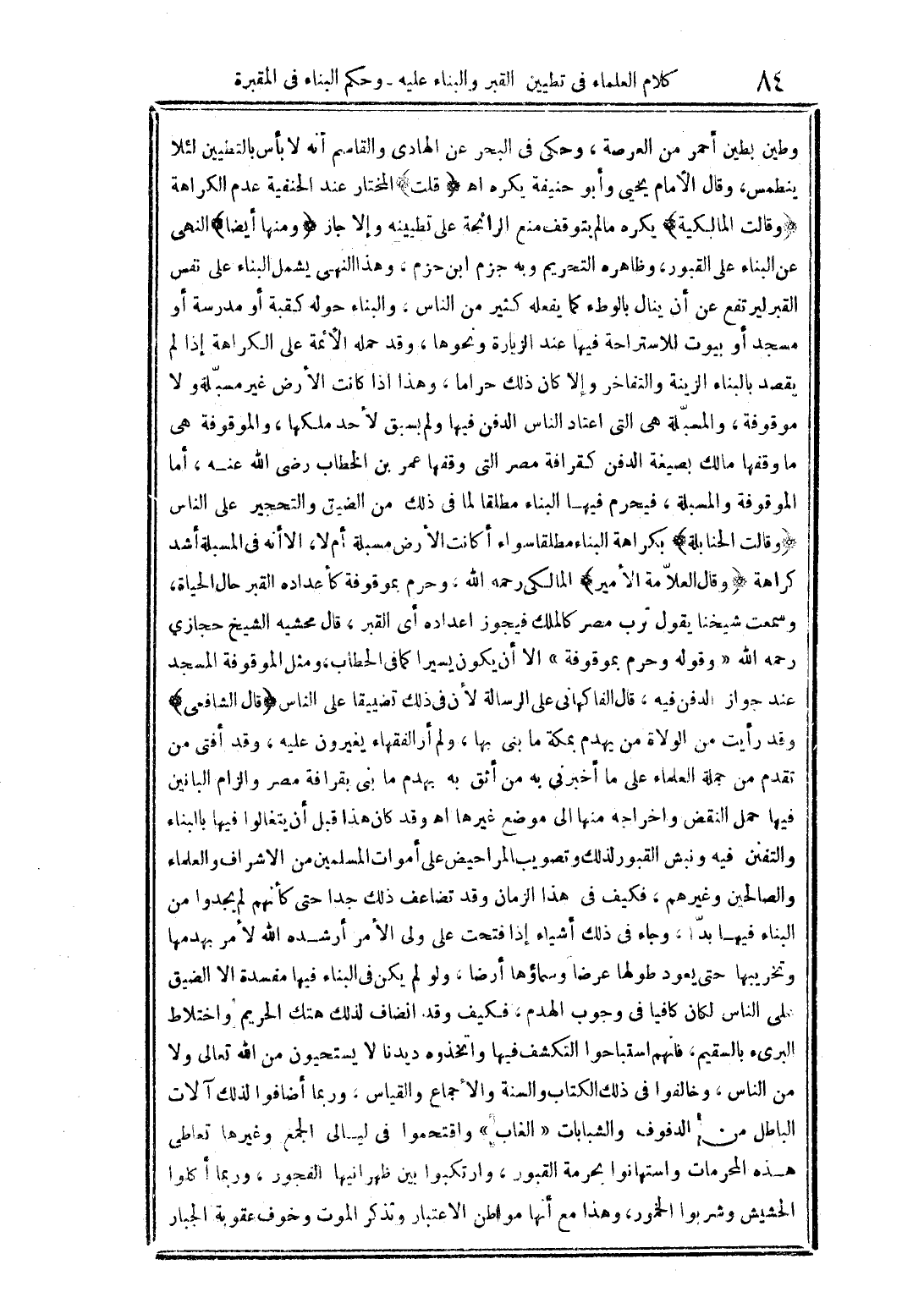 وطين بطين أحمر من العرصة، وحكي في البحر عن الهادي والقاسم أنه لا بأس بالتطيين لئلا ينطمس، وقال الإمام يحيى وأبو حنيفة يكره أهـ (قلت) المختار عند الحنفية عجم الكراهة (وقالت المالكية) يكره ما لم يتوقف منع الرائحة على تطيينه وإلا جاز (ومنها أيضا) النهي عن البناء على القبور، وظاهره التحريم وبه جزم ابن حزم، وهذا النهي يشمل البناء على نفس القبر ليرتفع عن أن ينال بالوطء كما يفعله كثير من الناس، والبناء حوله كقبة أو مدرسة أو مسجد أو بيوت للاستراحة فيها عند الزيارة ونحوها، وقد حمله الأئمة على الكراهة إذا لم يقصد بالبناء الزينة والتفاخر وإلا كان ذلك حراما، وهذا إذا كانت الأرض غير مسبلة ولا موقوفة، والمسبلة هي التي اعتاد الناس الدفن فيها ولم يسبق لأحد ملكها، والموقوفة هي ما وقفها مالك بصيغة الدفن كقرافة مصر التي وقفها عمر بن الخطاب رضي الله عنه، أما الموقوفة والمسبلة، فيحرم فيها البناء مطلقا لما في ذلك من الضيق والتحجير على الناس (وقالت الحنابلة بكراهة البناء مطلقا سواء كانت الأرض مسبلة أم لا، إلا أنه في المسبلة أشد كراهة (وقال العلامة الأمير) المالكي رحمه الله، وحرم موقوفة كأعداده القبر حال الحياة، وسمعت شيخنا يقول رب مصر كالملك فيجوز إعداده أي القبر، قال محشيه الشيخ الحجازي رحمه الله "وقوله وحرم موقوفة" إلا أن يكون يسيرا كما في الخطاب، ومثل الموقوفة المسجد عند جواز الدفن فيه، قال الفاكهاني على الرسالة لأن في ذلك تضييقا على الناس (قال الشافعي) وقد رأيت من الولاة من يهدم بمكة ما بني بها، ولم أر الفقهاء يغيرون عليه، وقد أفتى من تقدم من جملة العلماء عل ما أخبرني به من أثق به يهدم ما بني بقرافة مصر وإلزام البانين فيها حمل النقض وإخراجه منها إلى موضع غيرها أهـ وقد كان هذا قبل أن يتغالوا فيها بالبناء والتفنن فيه ونبش القبور لذلك وتصويب المراحيض على أموات المسلمين من الأشراف والعلماء والصالحين وغيرهم، فكيف في هذا الزمان وقد تضاعف ذلك جدا حتى كأنهم لم يجدوا من البناء فيها بدا، وجاء في ذلك أشياء إذا فتحت على ولي الأمر أرشده الله لأمر بهدمها وتخريبها حتى يعود طولها عرضا وسماؤها أرضا، ولو لم يكن في البناء فيها مفسدة إلا الضيق على الناس لكان كافيا في وجوب الهدم، فكيف وقد انضاف لذلك هتك الحريم واختلاط البرئ بالسقيم، فإنهم استباحوا التكشف فيها واتخذوه ديدنا لا يستحيون من الله تعالى ولا من الناس، وخالفوا في ذلك الكتاب والسنة والإجماع والقياس، وربما أضافوا لذلك آلات الباطل من الدفوف والشبابات "الغاب" واقتحموا في ليالي الجمع وغيرها تعاطي هذه المحرمات واستهانوا بحرمة القبور، وارتكبوا بين ظهرانيها الفجور، وربما أكلوا الحشيش وشربوا الخمور، وهذا مع أنها مواطن الاعتبار ةتذكر الموت وخوف عقوبة الجبار