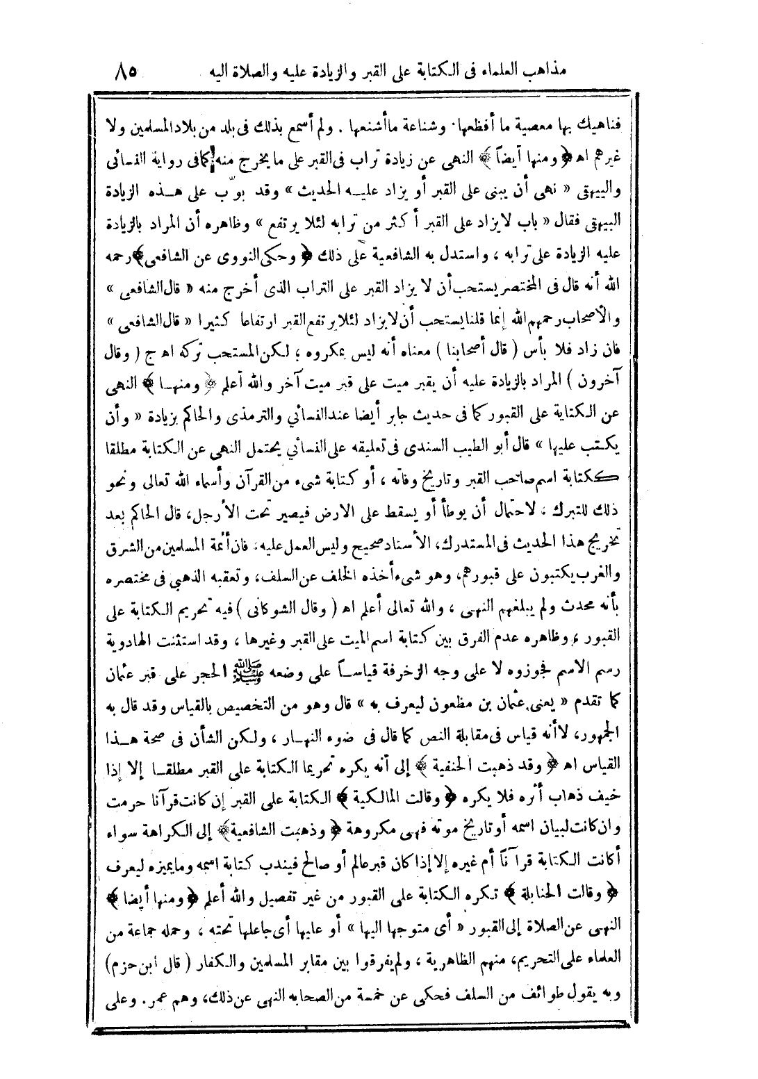 فناهيك بها معصية ما أفظعها وشناعة ما أشنعها، ولم أسمع بذلك في بلد من بلاد المسملين ولا غيرهم أهـ (ومنها أيضا) النهي عن زيادة تراب القبر على ما يخرج منه كما في رواية النسائي والبيهقي "نهي أن يبنى على القبر أو يزاد عليه الحديث" وقد بوب على هذه الزيادة البيهقي فقال "باب لا يزاد على القبر أكثر من ترابه لئلا يرتفع" وظاهره أن المراد بالزيادة عليه الزيادة على ترابه، واستدل به الشافعية على ذلك (وحكى النووي عن الشافع) رحمه الله أنه قال في المختصر يستحب أن لا يزاد القبر على التراب الذي أخرج منه "قال الشافعي" والأصحاب رحمهم الله إنما قلنا يستحب أن لايزاد لئلا يرتفع القبر ارتفاعا كثيرا "قال الشافعي" فإن زاد فلا بأس (قال أصحابنا) معناه أنه ليس بمكروه؛ لكن المستحب تركه أهـ ج (وقال آخرون) المراد بالزيادة عليه أن يقبر ميت على قبر ميت آخر والله أعلم (ومنها) النهي عن الكتابة على القبور كما في حديث جابر أيضا عند النسائي والترمذي والحاكم بزيادة "وأن يكتب عليها" قال أبو الطيب السندي في تعليقه على النسائي يحتمل النهي عن الكتابة مطلقا ككتابة ةاسم صاحب القبر وتاريخ وفاته، أو كتابة شيء من القرآن وأسماء الله الحسنى ونحو ذلك للتبرك، لاحتمال أن يوطأ أو يسقط على الأرض فيصير تحت الأرجل، قال الحاكم بعد تخريج هذا الحديث في المستدرك، الإسناد صحيح وليس العمل عليه، فإن أئمة المسلمين من الشرق والغرب يكتبون على قبورهم، وهو شئ أخذه الخلف عن السلف، وتعقبه الذهبي في مختصره بأنه محدث ولم يبلغهم النهي، والله تعالى أعلم أهـ (وقال الشوكاني) فيه تحريم الكتابة علي القبور، وظاهره عدم الفرق بين كتابة اسم الميت على القبر وغيرها، وقد استثنت الهادوية رسم الاسم فجوزوه لا على وجه الزخرفة قياسا على وضعه صلى الله عليه وسلم الحجر على قبر عثمان كما تقدم (يعني. عثمان بن مظعون ليعرف به" قال وهو من التخصيص بالقياس وقد قال به الجمهور، لا أنه قياس في مقابلة النص كما قال في ضوء النهار، ولكن الشأن في صحة هذا القياس أهـ (وقد ذهبت الحنفية) إلى أن يكره تحريما الكتابة على القبر مطلقا إلا إذا خيف ذهاب أثره فلا يكره "ووقالت المالكية) الكتابة على القبر إن كانت قرآنا حرمت وإن كانت لبيان اسمه أو تاريخ موته فهي مكروهة (وذهبت الشافعية) إلى الكراهة سواء أكانت الكتابة قرآنا أم غيره إلا إذا كان قبر عالم أو صالح فيندب كتابة اسمه وما يميزه ليعرف (وقالت الحنابلة) تكره الكتابة على القبور من غير تفصيل والله أعلم (ومنها أيضا) النهي عن الصلاة إلى القبور "أي متوجها إليها" أو عليها أي جاعلها تحته، وحمله جماعة من العلماء على التحريم، منهم الظاهرية، ولم يفرقوا بين مقابر المسلمين والكفار (قال ابن حزم) وبه يقول طوائف من السلف فحكى عن خمسة من الصحابة النهي عن ذلك، وهم عمر. وعلي