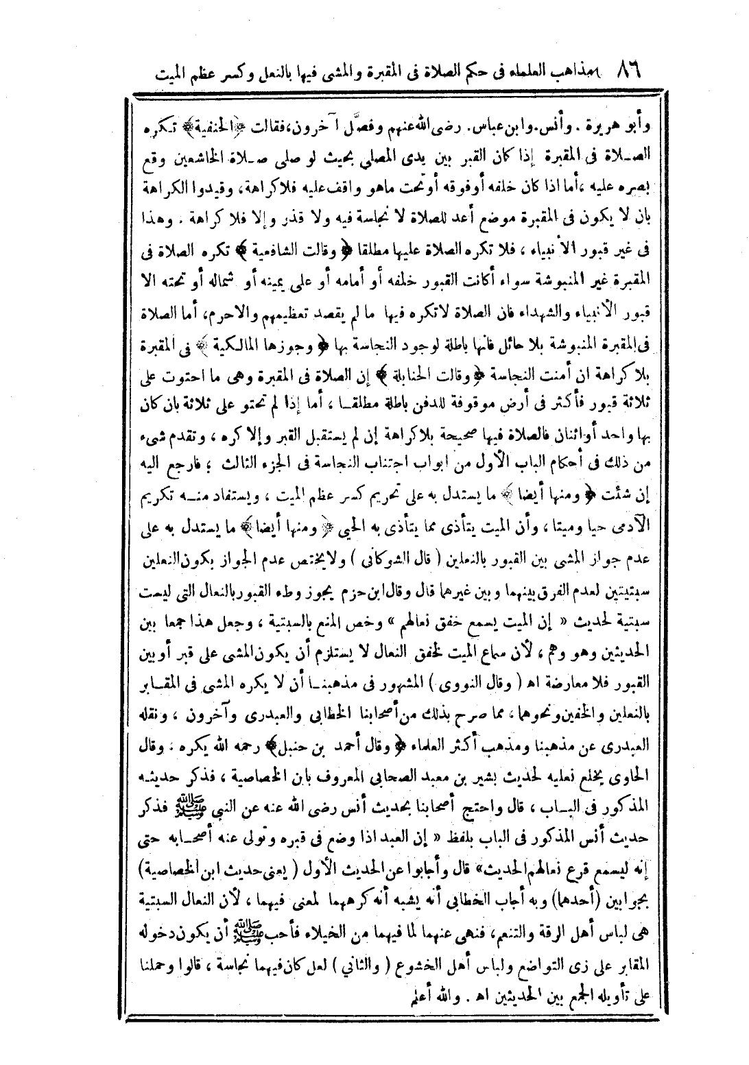 وأبو هريرة. وأنس. وابن عباس. رضي الله عنهم وفصل آخرون، فقالت (الحنفية) تكره الصلاة في المقبرة إذا كان القبر بين يدي المصلي بحيث لو صلى صلاة الخاشعين وقع بصره عليه، أما إذا كان خلفه أو فوقه أو تحت ما هو واقف عليه فلا كراهة، وقيدوا الكراهة بأن لا يكون في المقبرة موضع أعد للصلاة لا نجاسة فيه ولا قذر وإلا فلا كراهة. وهذا في غير قبور الأنبياء، فلا تكره الصلاة عليها مطلقا (وقالت الشافعية) تكره الصلاة في المقبرة غير المنبوشة سواء أكانت القبور خلفه أو أمامه أو على يمينه أو شماله أو تحته إلا قبور الأنبياء والشهداء فإن الصلاة في المقبرة وهي ما احتوت على ثلاثة قبور فأكثر في أرض موقوفة للدفن باطلة مطلقا، أما إذا لم تحتو على ثلاثة بأن كان بها واحد أو اثنان فالصلاة فيها صحيحة بلا كراهة إن لم يستقبل القبر وإلا كره، وتقدم شيء من ذلك في أحكام الباب الأول من أبواب اجتناب النجاسة في الجزء الثالث؛ فارجع إليه إن شئت (ومنها أيضا) ما يستدل به على تحريم كسر عظم الميت، ويستفاد منه تكريم الآدمي حيا وميتا، وأن الميت يتأذى مما يتأذى به الحيي (ومنها أيضا) ما يستدل به على عدم جواز المشي بين القبور بالنعلين (قال الشوكاني) ولا يختص عدم الجواز بكون النعلين سبتيتين لعدم الفرق بينهما وبين غيرهما قال وقال ابن حزم يجوز وطء القبور بالنعال التي ليست سبتية لحديث "إن الميت يسمع خفق نعالهم" وخصخ المنبع بالسبتية، وجعل هذا جمعا بين الحديثنين وهو وهم، لأن سماع الميت لخفق النعال لا يستلزم أن يكون المشي على القبر أو بين القبور فلا معارضة أهـ (وقال النووي) المشهور في مذهبنا أن لا يكره المشي في المقابر بالنعلين فلا معارضة أهـ (وقال النووي) المشهور في مذهبنا أن لا يكره المشي في المقابر بالنعلين والخفين ومحوهما، مما صرح بذلك من أصحابنا الخطابي والعبدري وآخرون، ونقله العبدري عن مذهبنا ومذهب أكثر العلماء (وقال أحمد بن حنبل) رحمه الله يكره، وقال الحاوي يخلع نعليه لحديث بشير بن معبد الصحابي المعروف بأن الخصاصية، فذكر حديثه المذكور في الباب بلفظ "إن العبد إذا وضع في قبره وتولى عنه أصحابه حتى إنه ليسمع قرع نعالهم الحديث" قال وأجابوا عن الحديث الأول (يعني حديث ابن الخصاصية) بجوابين (أحدهما) وبه أجاب الخطابي أنه يشبه أنه كرههما لمعنى فيهما، لأن النعال السبتية هي لباس أهل الرقة والتنعم، فنهى عنهما لمافيهما من الخيلاء فأحب صلى الله عليه وسلم أن يكون دخوله المقابر على زي التواضع ولباس أهل الخشوع (والثاني) لعل كان فيهما نجاسة، قالوا وحملنا على تأويله الجمع بين الحديثين أهـ والله أعلم.