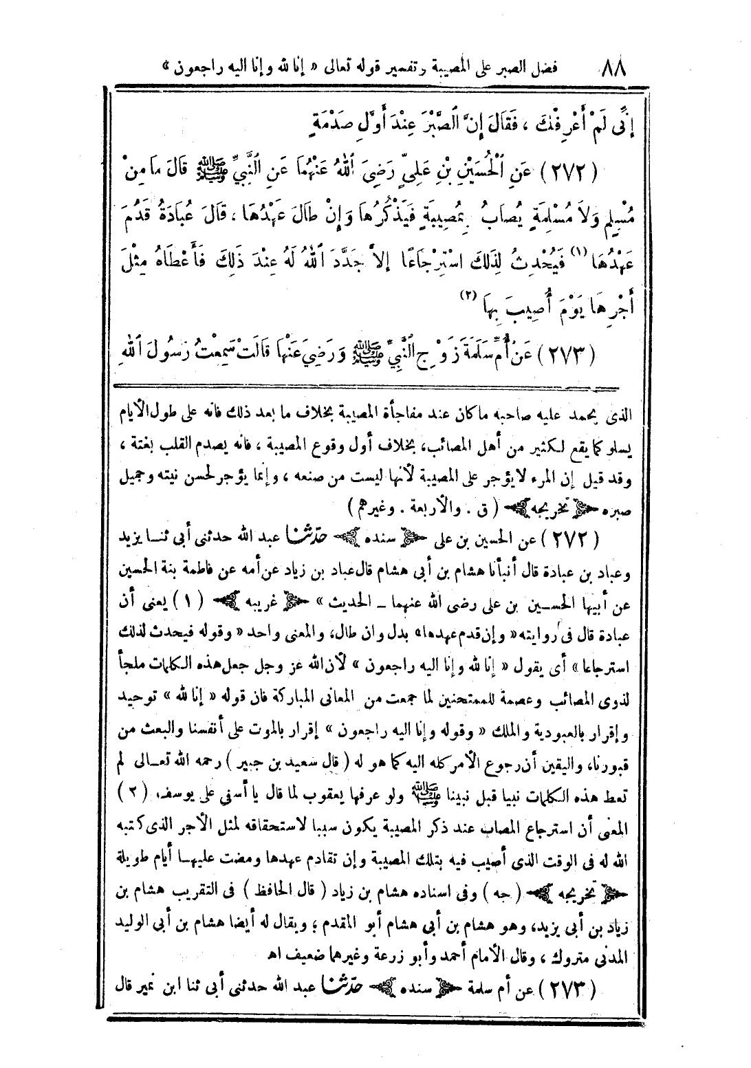 (272) عن الحسين بن علي رضي الله عنهما عن النبي صلى الله عليه وسلم قال ما من مسلم ولا مسلمة يصاب بمصيبة فيذكرها وإن طال عهدها، قال عبادة قدم عهدها فيحدث لذلك استرجاعا إلا جدد الله له عند ذلك فأعطاه مثل أجرها يوم أصيب بها