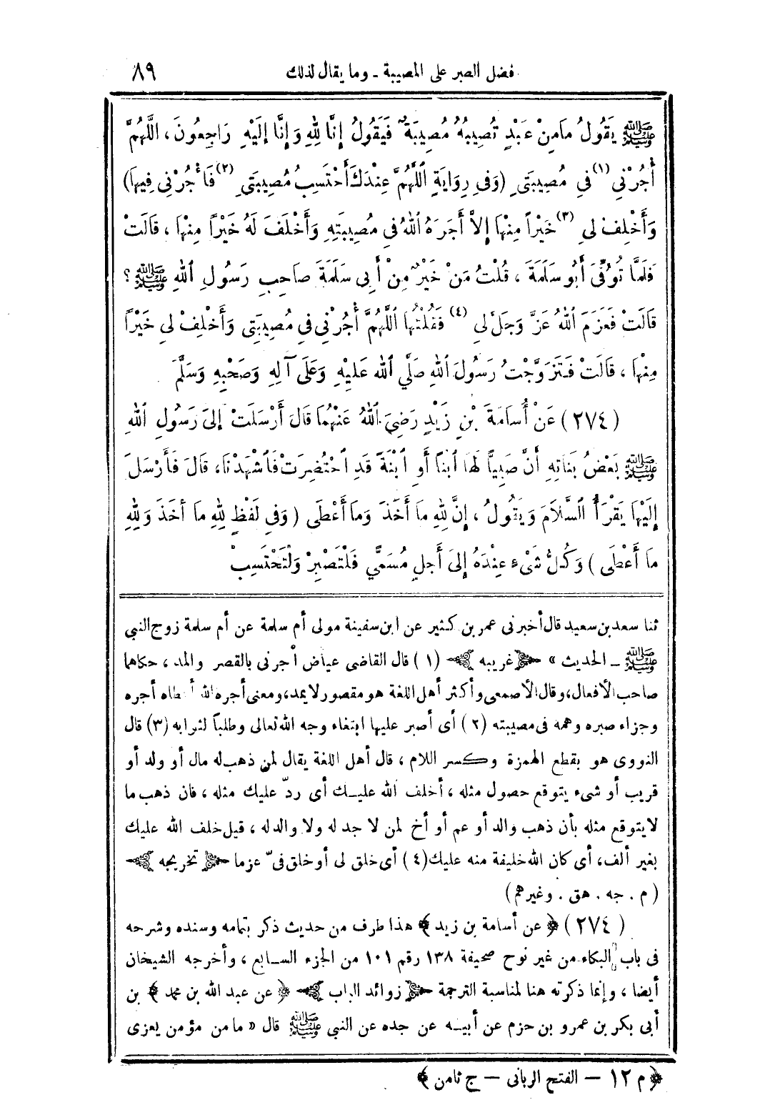 (274) عن أسامة بن زيد رضي الله عنهما قال أرسلت إلى رسول الله صلى الله عليه وسلم بعض بناته أن صبيا لها ابنا أو ابنة قد احتضرت فاشهدنا، قال فأرسل إليها يقرأ السلام ويقول، إن لله ما أخذ وما أعطى (وفي لفظ لله ما أخذ ولله ما أعطي) وكل شيء عنده إلى أجل مسمى فتصبر ولتحتسب