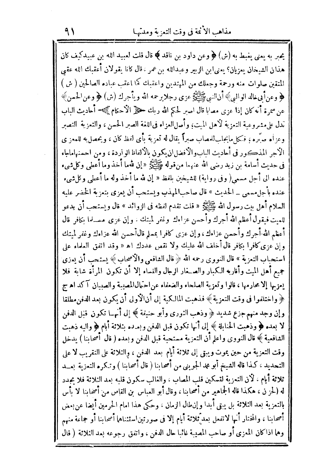 يجبر به يعني يغبط به (ش) (وعن داود بن ناقد) قال قلت لعبيد الله بن عبيد كيف كان هذان الشيخان يعزيان؟ يعني ابن الزبير وعبد الله بن عمر، قال كانا يقولان أعقبك الله عقبي المتقين صلوات منه ورحمة جعلك من المهتدين واعقبك كما اعقب عباده الصالحين (ش) (وعن أبي خالد الوالبي) أن النبي صلى الله عليه وسلم عزى رجلا يرحمه الله ويأجرك (ش) (وعن الحسن) عن سمرة أنه كان إذا عزى مصابا قال اصبر لحكم الله ربك (الأحكام) أحاديث الباب تدل على مشروعية التعزية لأهل الميت؛ وأصل العزاء في اللغة الصبر الحسن، والتعزية التصبر وعزاه صبره؛ فكل ما يجلب للمصاب صبرا يقال له تعزية بأي لفظ كان، ويحصل به للمعزى الأجر المذكور في أحاديث الباب والأفضل أن يكون بالألفاظ الواردة، ومن أحسنها ما جاء في حديث أسامة بن زيد رضي الله عنهما من قوله صلى الله عليه وسلم "إن لله ما أخذ وله ما أعطى وكل شيء عنده بأجل مسمى- الحديث" قال صاحب المهذب ويستحب أن يعزي بتعزية الخضر عليه السلام أهل بيت رسول الله صلى الله عليه وسلم "قلت تقدم لفظه في الزوائد" قال ويستحب أن يدعو للميت فيقول أعظم الله أجرك وأحسن عزاءك، وإن عزى كافرا بمسلم قال أحسن الله عزاءك وغفر لميتك وإن عزى كافرا بكافر قال أخلف الله عليك ولا نقص عددك أهـ "وقد اتفق العلماء على استحباب التعزية" قال النووي رحمه الله (قال الشافعي والأصحاب) يستحب أن يعزي جميع أهل الميت وأقاربه الكبار والصغار الرجال والنساء إلا أن تكون المراة شابة فلا يعزيها إلا محارمها، قالوا وتعزية الصلحاء والضعفاء عن احتمال المصيبة والصبيان آكد أهـ ج (واختلفوا في وقت التعزية) من حين يموت ويبقى إلى ثلاثة أيام بعد الدفن، والثلاثة على التقريب لا على التحديد، كذا قال الشيخ أبو محمد الجويني من أصحابنا (قال أصحابنا) وتكره التعزية بعد ثلاثة أيام، لأن التعزية لتسكين قلب المصاب، والغالب سكون قلبه بعد الثلاثة فلا يجدد له الحزن، هكذا قاله الجماهير من أصحابنا، وقال أبو العباس بن القاص من أصحابنا لا بأس بالتعزية بعد الثلاثة بل يبقى أبدا وإن طال الزمان، وحكى هذا إمام الحرمين ايضا عن بعض أصحابنا، والمختار أنها لا تفعل بعد ثلاثة أيام إلا في صورتين استثناهما أصحابنا أو جماعة منهم وهما إذا كان المغزى أو صاحب المصيبة غائبا حال الدفن، واتفق رجوعه بعد الثلاثة (قال