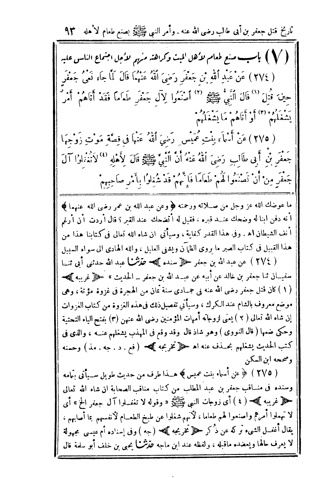 (275) عن أسماء بنت عميس رضي الله عنها في قصة موت زوجها جعفر بن أبي طالب رضي الله عنه أن النبي صلى الله عليه وسلم قال لأهله لاتغفلوا آل جعفر من أن تصنعوا لهم طعاما فإنهم قد شغلوا بأمر صاحبهم.
