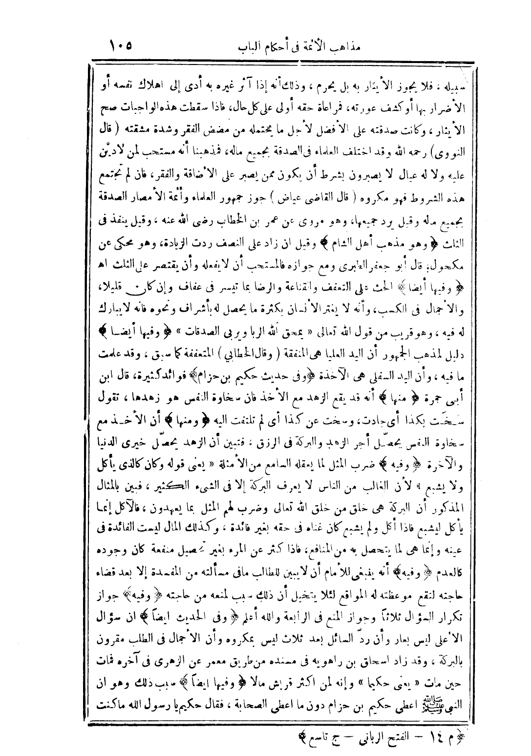 سبيله؛ فلا يجوز الإيثار به بل يحرم، وذلك أنه إذا آثر غيره به أدي إلا إهلاك نفسه أو الأضرار بها أو كشف عورته، فمراعاة حقه أولى على كل حال، فإذا سقطت هذه الواجبات صح الإيثار، وكانت صدقته على الأفضل لأجل ما يحتمله من مضض الفقر وشدة مشقته (قال النووي) رحمه الله وقد اختلف العلماء في الصدقة بجميع ماله، فمذهبنا أنه مستحب لمن لا دين له ولا له عيال لا يصبرون بشرط أن يكون ممن يصبر على الإضافة والفقر، فإن لم تجتمع هذه الشروط فهو مكروه (قال القاضي عياض) جوز جمهور العلماء وأئمة الأمصار الصدقة بجميع ما له وقيل يرد جميعها، وهو مروي عن عمر بن الخطاب رضي الله عنه، وقيل ينفذ في الثلث (وهو مذهب أهل الشام) وقيل أن زاد على النصف ردت الزيادة، وهو محكي عن مكحول: قال أبو جعفر الطبري ومع جوازه فالمستحب أن لا يفعله وأن يقتصر على الثلث أهـ (وفيه أيضًا) الحث على التعفف والقناعة والرضا بما تيسر في عفاف وإن كان قليلاً، والإجمال في الكسب، وأنه لا يغتر الإنسان بكثرة ما يحصل له بإشراف ونحوه فإنه لا يبارك له فيه، وهو قريب من قول الله تعالى "يمحق الله الربا ويربي الصدقات" (وفيها أيضً) دليل لمذهب الجمهور أن اليد العليا هي المنفقة (وقال الخطابي) المتعففة كما سبق، وقد علمت ما فيه، وأن اليد السفلي هي الآخذه (وفي حديث حكيم بن حزام) فوائد كثيرة، قال ابن أبى جمرة (منها) أنه قد يقع الزهد مع الأخذ فإن سخاوة النفس هو زهدها، تقول سخت بكذا أي جادت، وسخت عن كذا أي لم تلتفت إليه (ومنها) أن الأخذ مع سخاوة النفس يحصل أجر الزهد والبركة في الرزق، فتبين أن الزهد يحصل خيري الدنيا والآخرة (وفيه) ضرب المثل لما يعقله السامع من الأمثلة "يعني قوله وكان كالذي يأكل ولا يشبع" لأن الغالب من الناس لا يعرف البركة إلا في الشيء الكثير، فبين بالمثال المذكور أن البركة هي خلق من خلق الله تعالى وضرب لهم المثل بما يعهدون، فالآكل إنما يأكل ليشبع فإذا أكل ولم يشبع كان غناه في حقه بغير فائدة، وكذلك المال ليست الفائدة في عينة وإنما هي لما يتحصل به من المنافع، فإذا كثر عن المرء بغير تحصيل منفعة كان وجوده كالعدم (وفيه) أنه ينبغي للإمام أن لا يبني للطالب ما في مسألته من المفسدة غلا بعد قضاء حاجته لنقع موعظته له المواقع لئلا يتخيل أن ذلك سبب لمنعه من حاجته (وفيه) جواز تكرار السؤال ثلاثاً وجواز المنع في الرابع والله أعلم (وفي الحديث أيضًا) أن سؤال الأعلى ليس بعار وأن رد السائل بعد ثلاث ليس بمكروه وأن الإجمال في الطلب مقرون بالبركة، وقد زاد إسحاق بن راهويه في سنده من طريق معمر عن الزهري في آخره فمات حين مات "يعني حكيمًا" وإنه لمن أكثر قريش مالاً (وفيها أيضًا) سبب ذلك وهو أن النبي (صلى الله عليه وسلم) أعطي حكيم بن حزام دون ما أعطي الصحابة، فقال حكيم يا رسول الله ما كنت