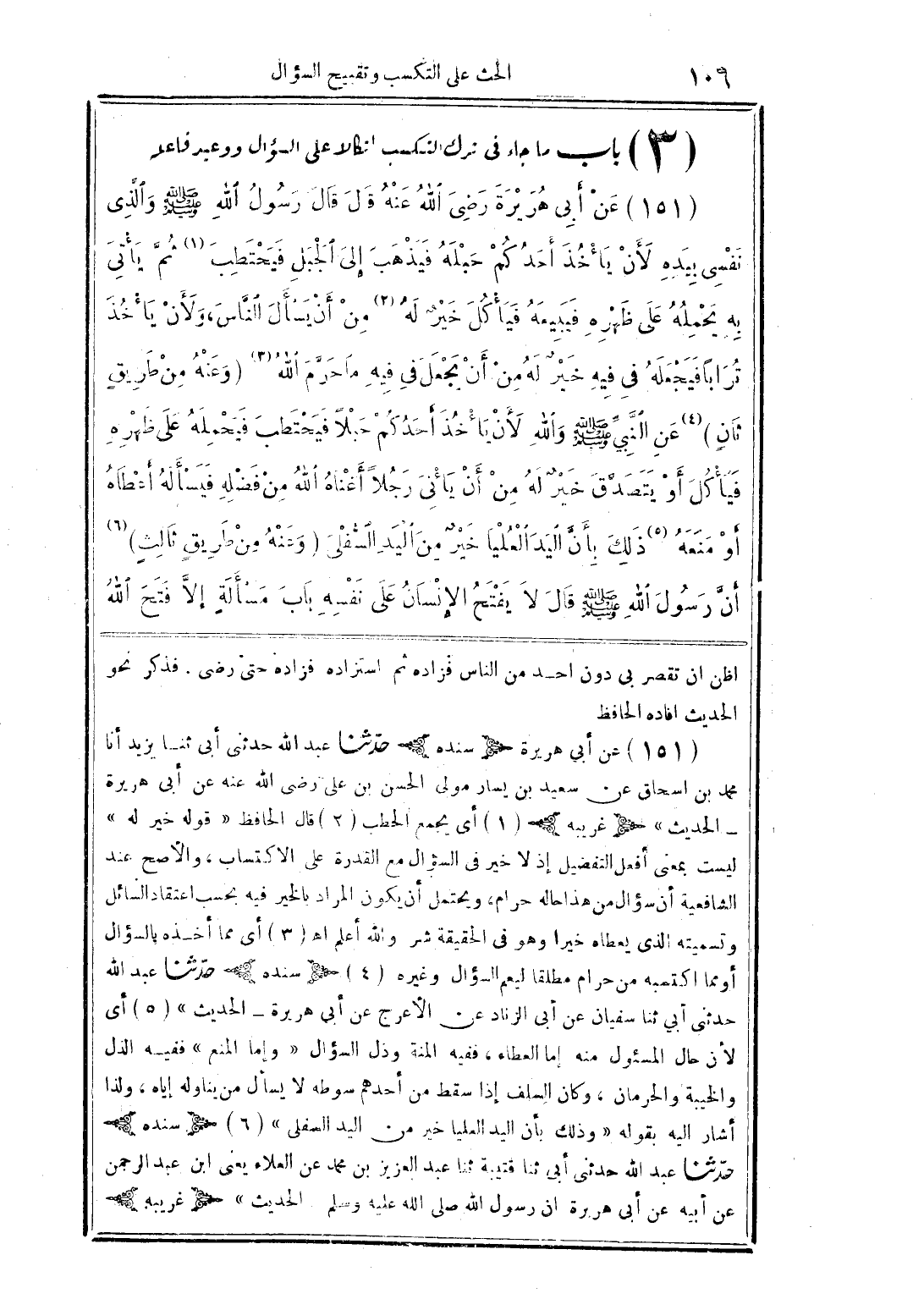 (151) عن أبى هريرة رضي الله عنه قال قال رسول الله (صلى الله عليه وسلم) والذي نفسي بيده لأن يأخذ أحدكم حبله فيذهب إلى الجبل فيحتطب (1) ثم يأتي به يحمله على ظهره فيبيعه فيأكل خير له (2) من أن يسأل الناس، ولأن يأخذ ترابًا فيجعله في خير له من أن يجعل في فيه ما حرم الله (3) (وعن من طريق ثان) (4) عن النبي (صلى الله عليه وسلم) والله لأن يأخذ أحدكم حبلا ًفيحتطب فيحمله على هره فيأكل أو يتصدق خير له من أن يأتي رجلاً أغناه الله من فضله فيسأله أعطاه أو منعه (5) ذلك بأن اليد العليا خير من اليد السفلى (وعنه من طريق ثالث) (6) أن رسول الله (صلى الله عليه وسلم) قال لا يفتح الإنسان على نفسه باب مسألة إلا فتح الله