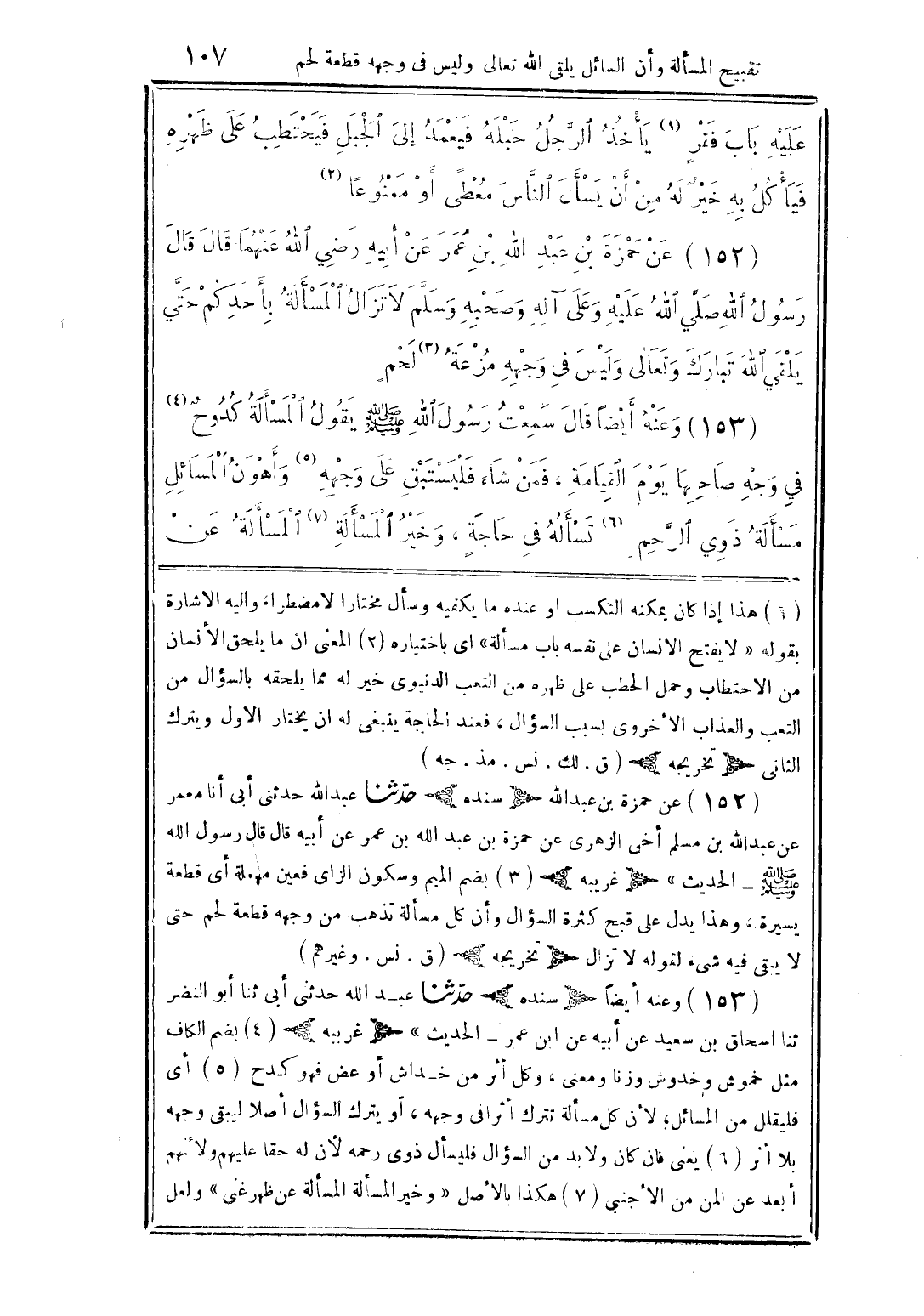 (152) عن حمزة بن عبد الله (سنده) حدّثنا عبد الله حدثني أبى أنا معمر عن عبد الله بن مسلم أخي الزهري عن حمزة بن عبد الله بن عمر عن أبيه قال قال رسول الله (صلى الله عليه وسلم) - الحديث (غريبة) (3) بضم الميم وسكون الزاي فعين مهملة أي قطعة يسيرة، وهذا يدل على قبح كثرة السؤال وأن كل مسألة تذهب من وجهه قطعة لحم حتى لا يبقي فيه شيء لقوله لا تزال (تخريجه) (ق. نس. وغيرهم).