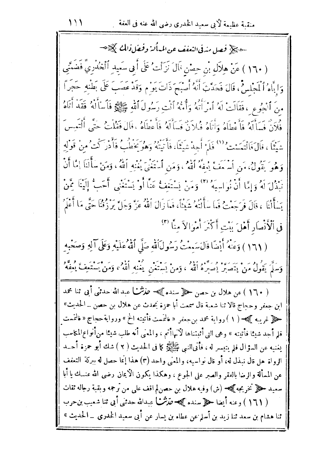 (160) عن هلال بن حصن قال نزلت على أبى سعيد الخدري فضمني وإياه المجسن قال فحدث أنه أصبح ذات يوم وقد عصب على بطنه حجرًا من الجوع، فقالت له امرأته وأمه أئت رسول الله (صلى الله عليه وسلم) فأسأله فقد أتاه فلان فسأله فأعطاه وأتاه فلان فسأله فأعطاه، قال فقلت حتى التمس شيئًا، قال فالتمست (1) فمل أجد شيئًا فأتيته وهو يخطب فأدركت من قوله وهو يقول، من أسعف يعفه الله، ومن أستغني يغنه الله، ومن سألنا إما أن نبدل له وإما أن نواسيه (3) ومن يستعف عنا أو يستغني أحب إلينا ممن يسألنا، قال فرجعت فما سألته شيئًا، فما زال الله عز وجل يرزقنا حتى ما أعلم في الأنصار أهل بيت أكثر أموالاً منا (3).