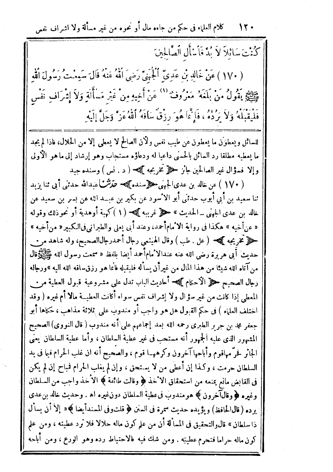 (170) عن خالد بن عدي الجهني رضي الله عنه قال سمعت رسول الله (صلى الله عليه وسلم) يقول من بلغه معروف عن أخيه من غير مسألة ولا إشراف نفس فليقبله ولا يرده، فإنما هو رزق ساقه الله عز وجل إليه