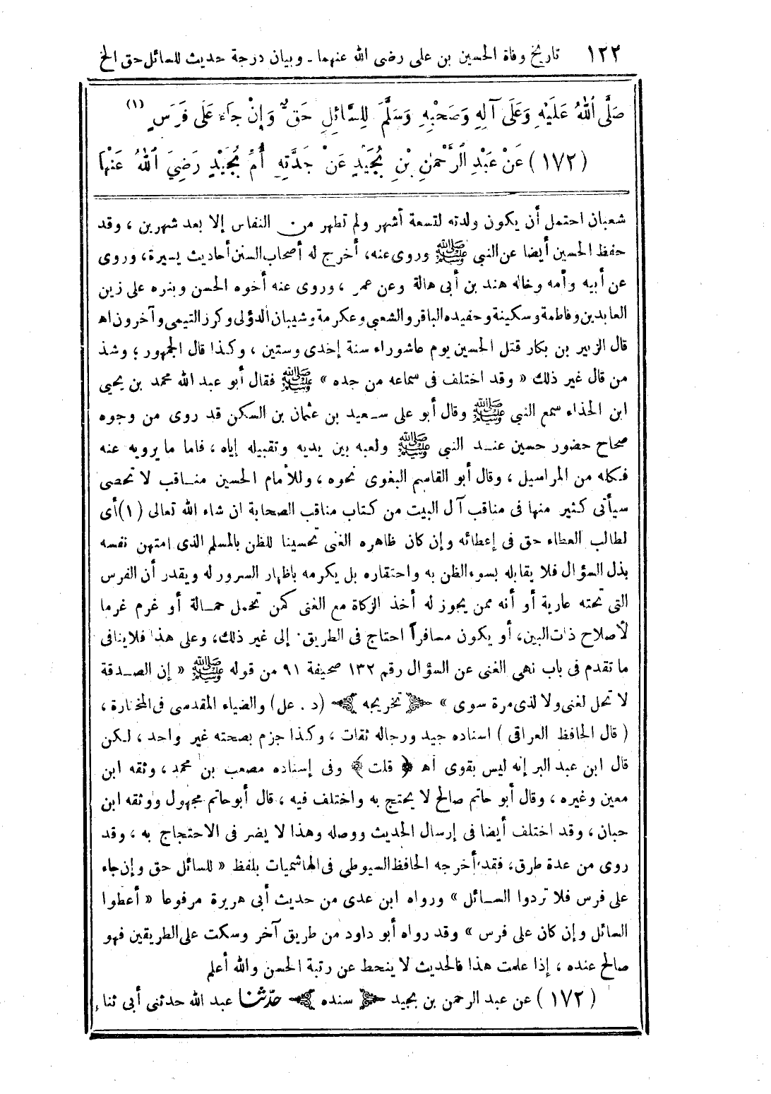 شعبان احتمل أن يكون ولدته لتسعة أشهر ولم تطهر من النفاس إلا بعد شهرين، وقد حفظ الحسين أيضًا عن النبي (صلى الله عليه وسلم) وروي عنه، أخرج له أصحاب السنن أحاديث يسيرة، وروي عن أبيه وأمه وخالد هند بن ابى هالة وعن عمر، وروي عنه أخوه الحسن وبنوه على زين العابدين وفاطمة وسكينة وحفيدة الباقر والشعبي وعكرمة وشيبان الدؤلي وكرز التيمي وآخرون أهـ قال الزبير بن بكار قتل الحسين يوم عاشوراء سنة إحدى وستين، وكذا قال الجمهور، وشذ من قال غير ذلك " وقد اختلف في سماعه من جده" (صلى الله عليه وسلم) فقال أبو عبد الله محمد بن يحيي أبن الحذاء سمع النبي (صلى الله عليه وسلم) وقال أبو على سعيد بن عثمان بن السكن قد روي من وجوه صحاح حضور حسين عند النبي (صلى الله عليه وسلم) ولعبه بين يديه وتقبيله إياه، فأما ما يرويه عنه فكلمة من المراسيل، وقال أبو القاسم البغوي نحوه، وللإمام الحسين مناقب لا تحصي سيأتي كثير منها في مناقب آل البيت من كتاب مناقب الصحابة إن شاء الله تعالى (1) لطالب العطاء حق في إعطائه وإن كان ظاهره الغني تحسينا للظن بالمسلم الذي امتهن نفسه بذل السؤال فلا يقابله بسوء الظن، وبه واحتقاره بل يكرمه بإظهار السرور له ويقدر أن الفرس التي تحته عارية أو أنه ممن يجوز له أخذ الزكاة مع الغني كمن تحمل حمالة أو غرم غرمًا لإصلاح ذات البين، أو يكون مسافرًا احتاج في الطريق، إلى غير ذلك، وعلى هذا فلا ينافي ما تقدم في باب نهي الغني عن السؤال رقم 132 صحيفة 91 من قوله (صلى الله عليه وسلم) "إن الصدقة لا تحل لغني ولا لذي مرة سوي" (تخريجه) (د. عل) والضياء المقدسي في المختارة، (قال الحافظ العراقي) إسناده جيد ورجاله ثقات، وكذا جزم بصحته غير واحد، لكن قال ابن عبد البر إنه ليس بقوي أهـ (قلت) وفي إسناده مصعب بن محمد، وثقة ابن معين وغيره، وقال أبو حاتم صالح لا يحتج به واختلف فيه، قال أبو حاتم مجهول ووثقه ابن حيان، وقد اختلف أيضًا في إرسال الحديث ووصله وهذا لا يضر في الاحتياج به، وقد روي من عدة طرق، فقد أخرجه الحافظ السيوطي في الهاشميات بلفظ (للسائل حق وإن جاء على فرس لا تردوا السائل" ورواه ابن عدي من حيث أبى هريرة مرفوعًا "أعطوه السائل وإن كان على فرس" وقد رواه أبو داود من طريق آخر وسكت على الطريقين فهو صالح عنده، إذا علمت هذا فالحديث لا ينحط عن رتبة الحسن والله أعلم