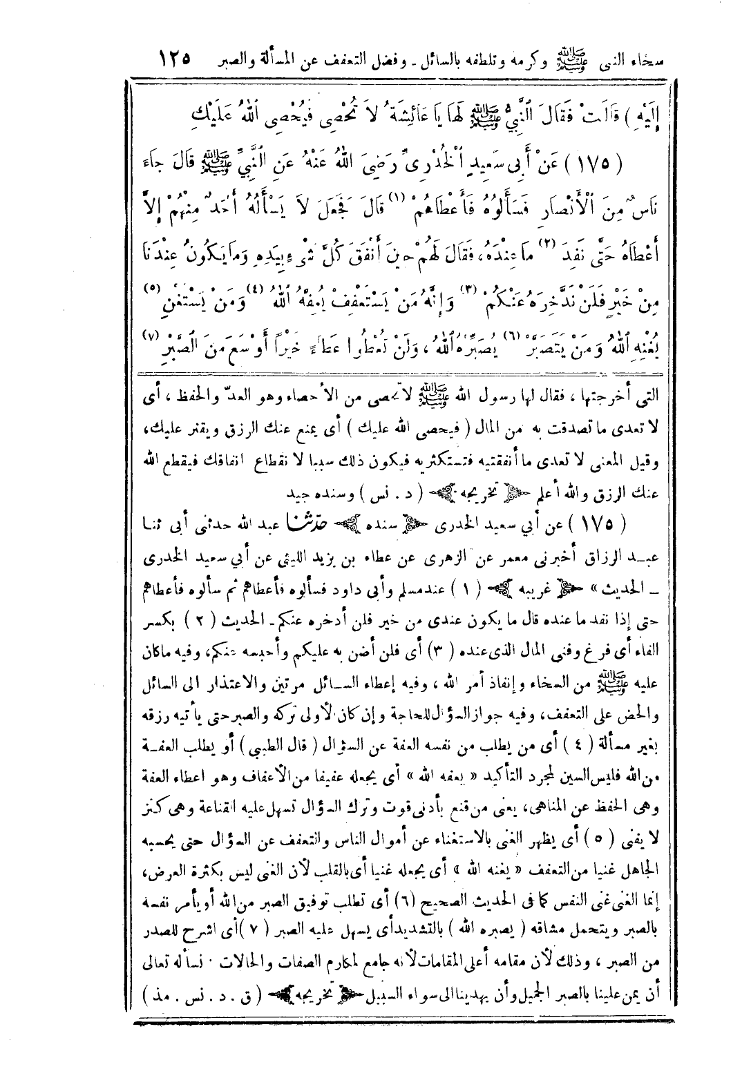 (175) عن أبى سعيد الخدري رضي الله عنه عن النبي (صلى الله عليه وسلم) قال جاء ناس من الأنصار فسألوه فأعطاهم (1) قال فجعل لا يسأله أحد منهم إلا أعطاه حتى نفد (2) ما عنده، فقال لهم حين أنفق كل شيء بيده وما يكون عندنا من خير فلن ندخره عنكم (3) وإنه من يستعفف يعفه الله (4) ومن يستغن (5) ليغنه الله ومن يتصبر (6) يصبره الله، ولن تعطوا عطاء خيرًا أوسع من الصبر (7).