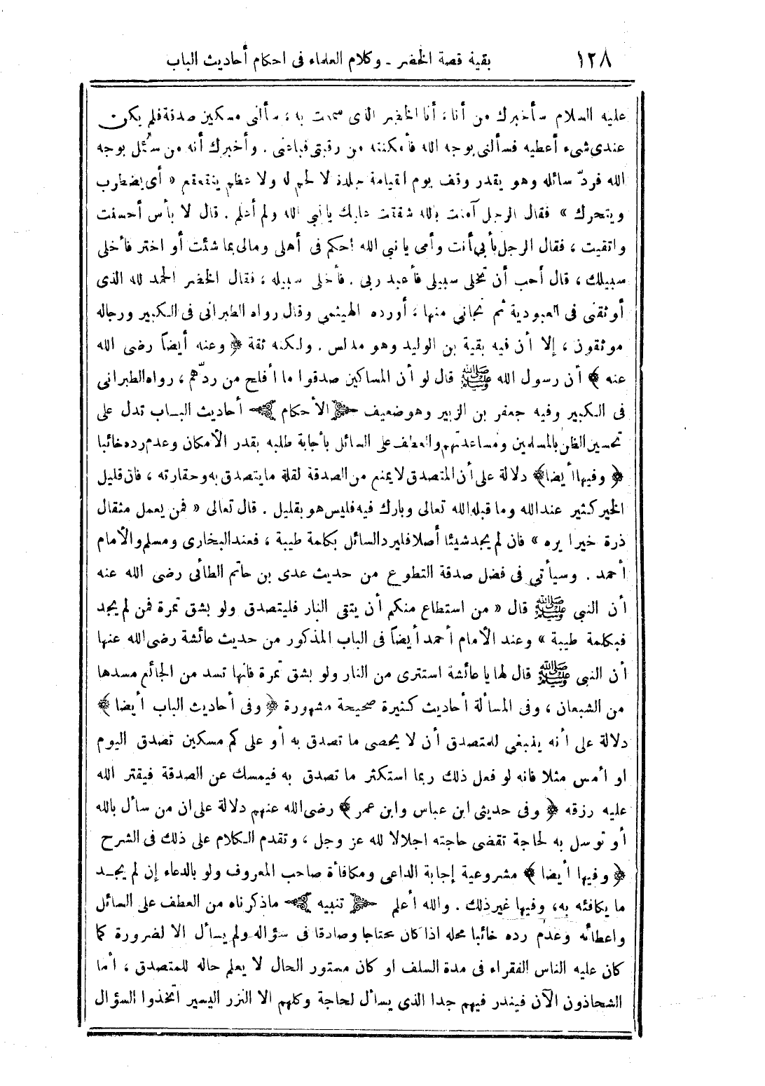 عليه السلام سأخبرك من أناة أنا الخضر الذي سعت به سألني مسكين صدقة فلم يكن عندي شيء أعطيه فسألني بوجه الله فأمكنته من رقبتي فباعني. وأخبرك أنه من سئل بوجه الله فرد سائله وهو يقدر وقف يوم القيامة جلدة لا لحم له ولا عظم يقعقع "أي يضطرب ويتحرك" فقال الرجل آمنت بالله شققت عليك يا نبي الله ولم أعلم. قال لا بأس أحسنت واتقيت، فقال الرجل يأبي أنت وأمي يا نبي الله أحكم في أهلي ومالي بما شئت أو اختر فأخلى سبيلك، قال أحب أن تخلي سبيلي فاعبد ربي. فاخلى سبيله، فقال الخضر الحمد لله الذي أوثقني في العبودية ثم نجاني منها، أورده الهيثمي وقال رواه الطبراني في الكبير ورجاله موثقون، إلا أن فيه بقية بن الوليد وهو مدلس. ولكنه ثقة (وعنه أيضًا رضي الله عنه) أن رسول الله صلى الله عليه وسلم قال لو أن المساكين صدقوا ما أفلح من ردهم، رواه الطبراني في الكبير وفيه جعفر بن الزبير وهو ضعيف (الأحكام) أحاديث الباب تدل على تحسين الظن بالمسلمين ومساعدتهم والعطف على السائل بإجابة طلبه بقدر الإمكان وعدم رده خائبًا (وفيها أيضًا) دلالة على أن المتصدق لا يمنع من الصدقة لقلة ما يتصدق به وحقارته، فإن قليل الخير كثير عند الله وما قبله الله تعالى وبارك فيه فليس هو بقليل. قال تعالى: {فمن يعمل مثقال ذرة خيرًا يره} فإن لم يجد شيئًا أصلاً فليرد السائل بكلمة طيبة، فعند البخاري ومسلم والأمام أحمد. وسيأتي في فضل صدقة التطوع من حديث عدى بن حاتم الطائي رضي الله عنه أن النبي صلى الله عليه وسلم قال: "من استطاع منكم أن يتقى النار فليتصدق ولو بشق تمرة فمن لم يجد فبكلمة طيبة" وعند الأمام أحمد أيضًا في الباب المذكور من حديث عائشة رضي الله عنها أن النبي صلى الله عليه وسلم قال لها يا عائشة استترى من النار ولو بشق تمرة فإنها تسد من الجائع مسدها من الشبعان، وفي المسألة أحاديث كثيرة صحيحة مشهورة (وفي أحاديث الباب أيضًا) دلالة على أنه ينبغي للمتصدق أن لا يحصى ما تصدق به أو على كم مسكين تصدق اليوم أو أمس مثلاً فإنه لو فعل ذلك ربما استكثر ما تصدق به فيمسك عن الصدقة فيقتر الله عليه رزقه (وفي حديثي ابن عباس وابن عمر) رضي الله عنهم دلال على أن من سأل بالله أو توسل به لحاجة تقضي حاجته اجلالا لله عز وجل، وتقدم الكلام على ذلك في الشرح (وفيها أيضًا) مشروعية إجابة الداعي ومكافأة صاحب المعروف ولو بالدعاء إن لم يجد ما يكافئه به، وفيها غير ذلك. والله أعلم (تنبيه) ما ذكرناه من العطف على السائل واعطائه وعدم رده خائبًا محله إذا كان محتاجًا وصادقًا في سؤاله ولم يسأل إلا لضرورة كما كان عليه الناس الفقراء في مدة السلف أو كان مستور الحال لا يعلم حاله للمتصدق، أما الشحاذون الآن فينذر فيهم جدًا الذي يسأل لحاجة وكلهم إلا النزر اليسير اتخذوا السؤال