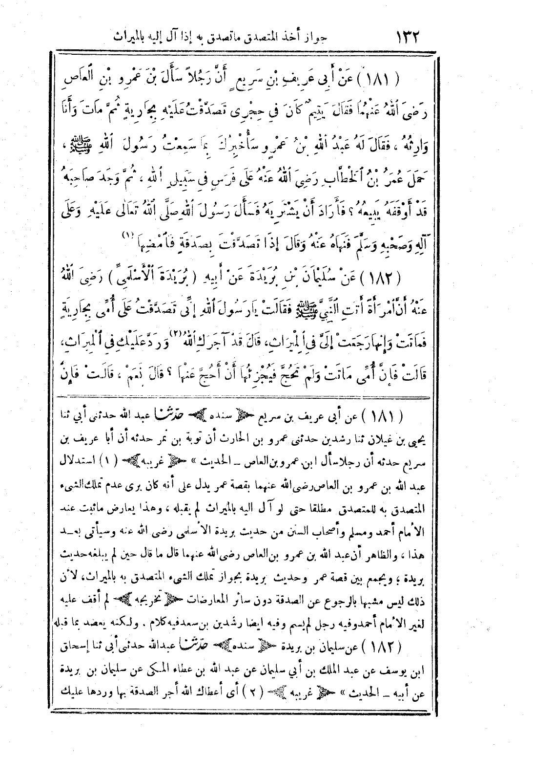 (181) عن أبي عريف بن سريعٍ أن رجلاً سأل بن عمرو بن العاص رضي الله عنهما فقال يتيم كان في حجري تصدقت عليه بجاريةٍ ثم مات وأنا وارثه، فقال له عبد الله بن عمرٍ وسأخبرك بما سمعت رسول الله صلى الله عليه وسلم، حمل عمر بن الخطاب رضي الله عنه على فرسٍ في سبيل الله، ثم وجد صاحبه قد أوقفه يبيعه؟ فأراد أن يشتريه فسأل رسول الله صلى الله تعالى عليه وعلى آله وصحبه وسلم فنهاه عنه وقال إذا تصدقت بصدقةٍ فامضها (1).