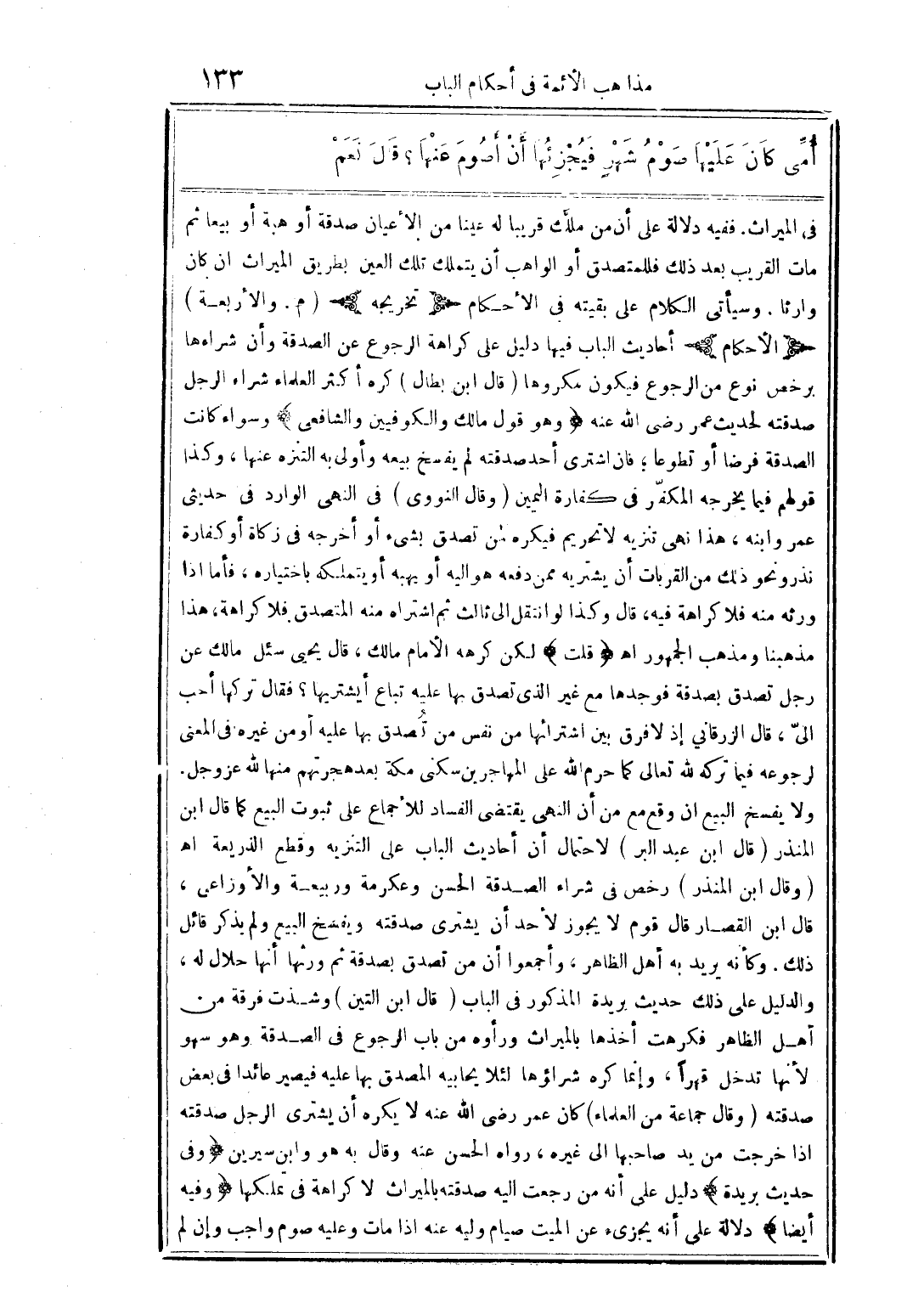 في الميراث. ففيه دلالة على أن ملك قريبا له عينا من الأعيان صدقة أو هبة أو بيعا ثم مات القريب بعد ذلك فللمتصدق أو الواهب أن يتملك تلك العين بطريق الميراث إن كان وارثا. وسيأتي الكلام على بقيته في الأحكام (تخريجه) (م. والأربعة) (الأحكام) أحاديث الباب فيها دليل على كراهة الرجوع عن الصدقة وأن شراءها برخص نوع من الرجوع فيكون مكروها (قال ابن بطال) كره أكثر العلماء شراء الرجل صدقته لحديث عمر رضي الله عنه (وهو قول مالك والكوفيين والشافعي) وسواء كانت الصدقة فرضا أو تطوعا؛ فإن اشترى أحد صدقته لم يفسخ بيعه وأولى به التنزه عنها، وكذا قولهم فيما يخرجه المكفر في كفارة اليمين (وقال النووي) في النهي الوارد في حديثي عمر وابنه، هذا نهى تنزيه لاتحريم فيكره لمن تصدق بشيء أو أخرجه في زكاة أو كفارة نذر ونحو ذلك من القربات أن يشتريه ممن دفعه هو إليه أو يهبه أو يتملكه باختياره، فأما إذا ورثه منه فلا كراهة فيه، قال وكذا لو انتقل إلى ثالث ثم اشتراه منه المتصدق فلا كراهة، هذا مذهبنا ومذهب الجمهور أهـ (قلت) لكن كرهه الأمام مالك، قال يحيي سئل مالك عن رجل تصدق بصدقة فوجدها مع غير الذي تصدق بها عليه تباع أيشتريها؟ فقال تركها أحب إلي، قال الزرقاني إذ لا فرق بين اشترائها من نفس من تصدق بها عليه أو من غيره في المعنى لرجوعه فيما تركه لله تعالى كما حرم الله على المهاجرين سكنى مكة بعد هجرتهم منها لله عز وجل. ولا يفسخ البيع إن وقع مع من أن النهي يقتضى الفساد للأجماع على ثبوت البيع كما قال ابن المنذر (قال ابن عبد البر) لاحتمال أن أحاديث الباب على التنزيه وقطع الذريعة أهـ (وقال ابن المنذر) رخص في شراء الصدقة الحسن وعكرمة وربيعة والأوزاعي، قال ابن القصار قال قوم لا يجوز لأحد أن يشترى صدقته ويفسخ البيع ولم يذكر قائل ذلك. وكأنه يريد به أهل الظاهر، وأجمعوا أن من تصدق بصدقة ثم ورثها أنها حلال له، والدليل على ذلك حديث بريدة المذكور في الباب (قال ابن التين) وشذت فرقة من أهل الظاهر فكرهت أخذها بالميراث ورأوه من باب الرجوع في الصدقة وهو سهو لأنها تدخل قهرًا، وإنما كره شراؤها لئلا يحابيه المصدق بها عليه فيصير عائدا في بعض صدقته (وقال جماعة من العلماء) كان عمر رضي الله عنه لا يكره أن يشترى الرجل صدقته إذا خرجت من يد صاحبها إلى غيره، رواه الحسن عنه وقال به هو وابن سيرين (وفي حديث بريدة) دليل على أنه من رجعت إليه صدقته بالميراث لا كراهة في تملكها (وفيه أيضا) دلالة على أنه يجزئ عن الميت صيان وليه عنه إذا مات وعليه صوم واجب وإن لم