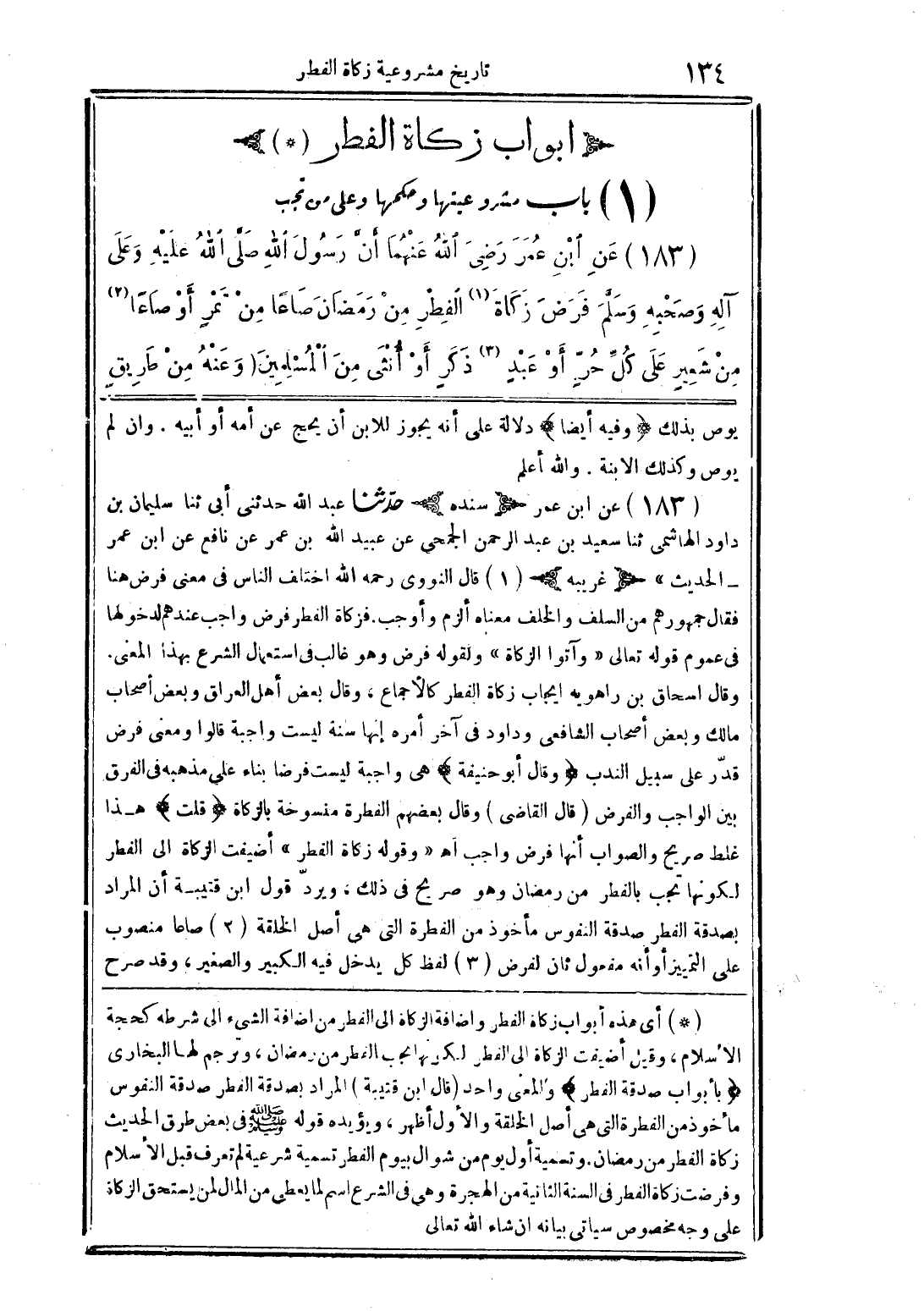 (183) عن ابن عمر رضي الله عنهما أن رسول الله صلى الله عليه وسلم وعلى آله وصحبه وسلم فرض زكاة (1) الفطر من رمضان صاعًا من تمرٍ أو صاعًا (2) من شعيرٍ على كل حرٍ أو عبدٍ (3) ذكرٍ أو أنثى من المسلمين (وعنه من طريق