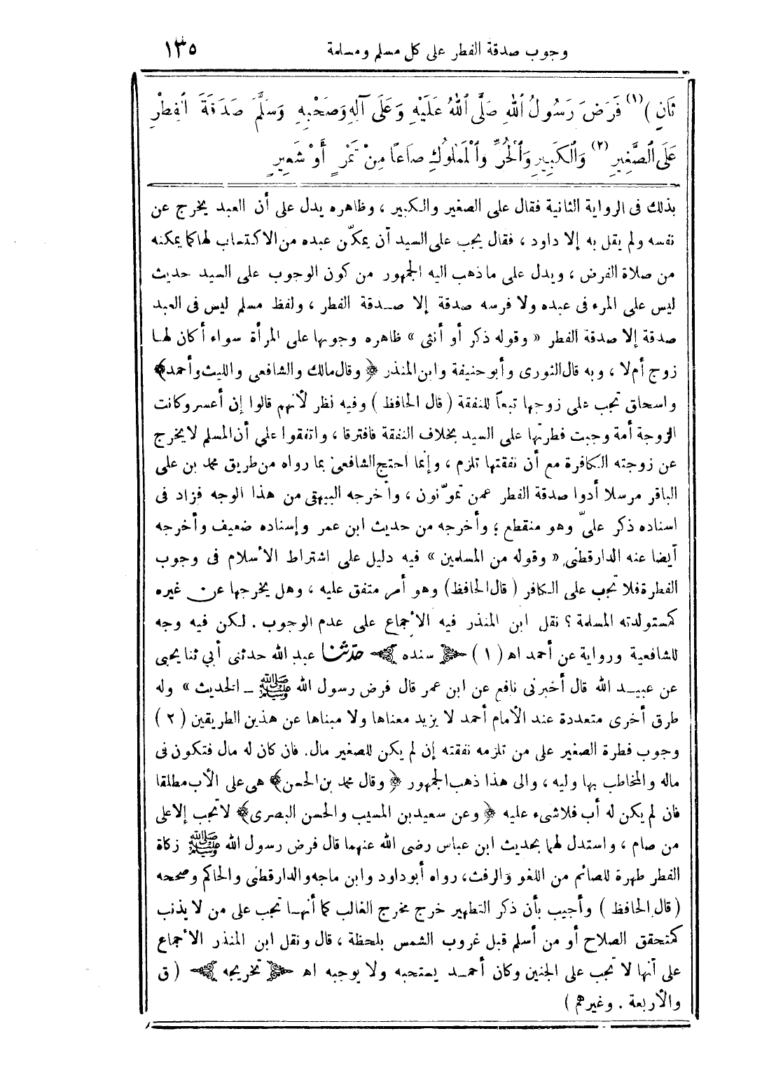 ثان) (1) فرض رسول الله صلى الله عليه وعلى آله وصحبه وسلم صدقة الفطر على الصغير (2) والكبير والحر والمملوك صاعًا من تمرٍ أو شعيرٍ